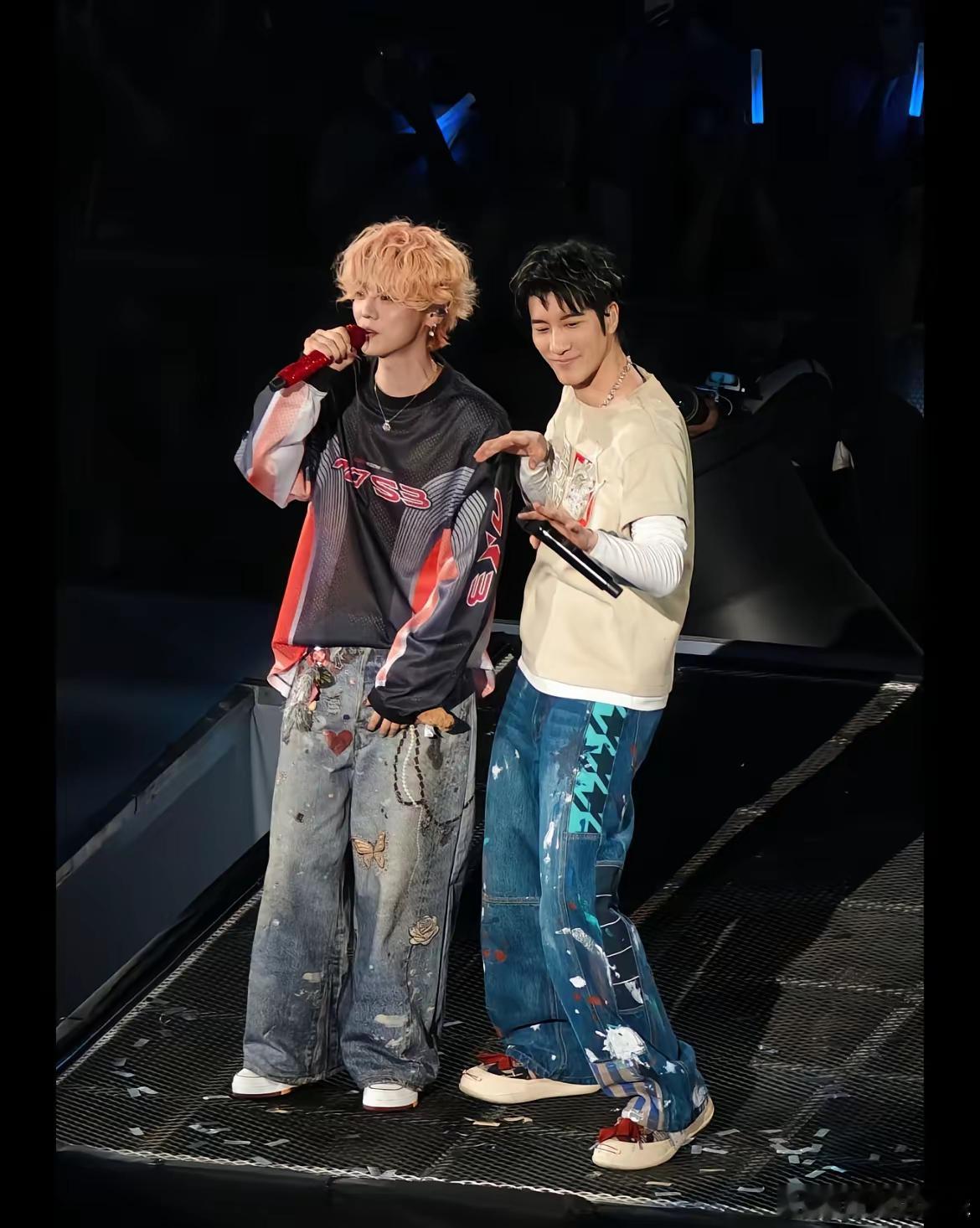 ​王力宏一头清爽的黑色短发,穿着体恤牛仔裤,简单但不失时尚感,鹿晗长相秀气,本来就显小。