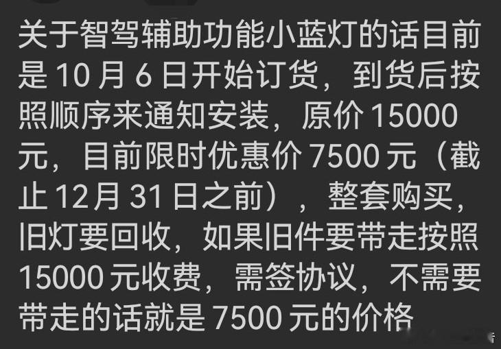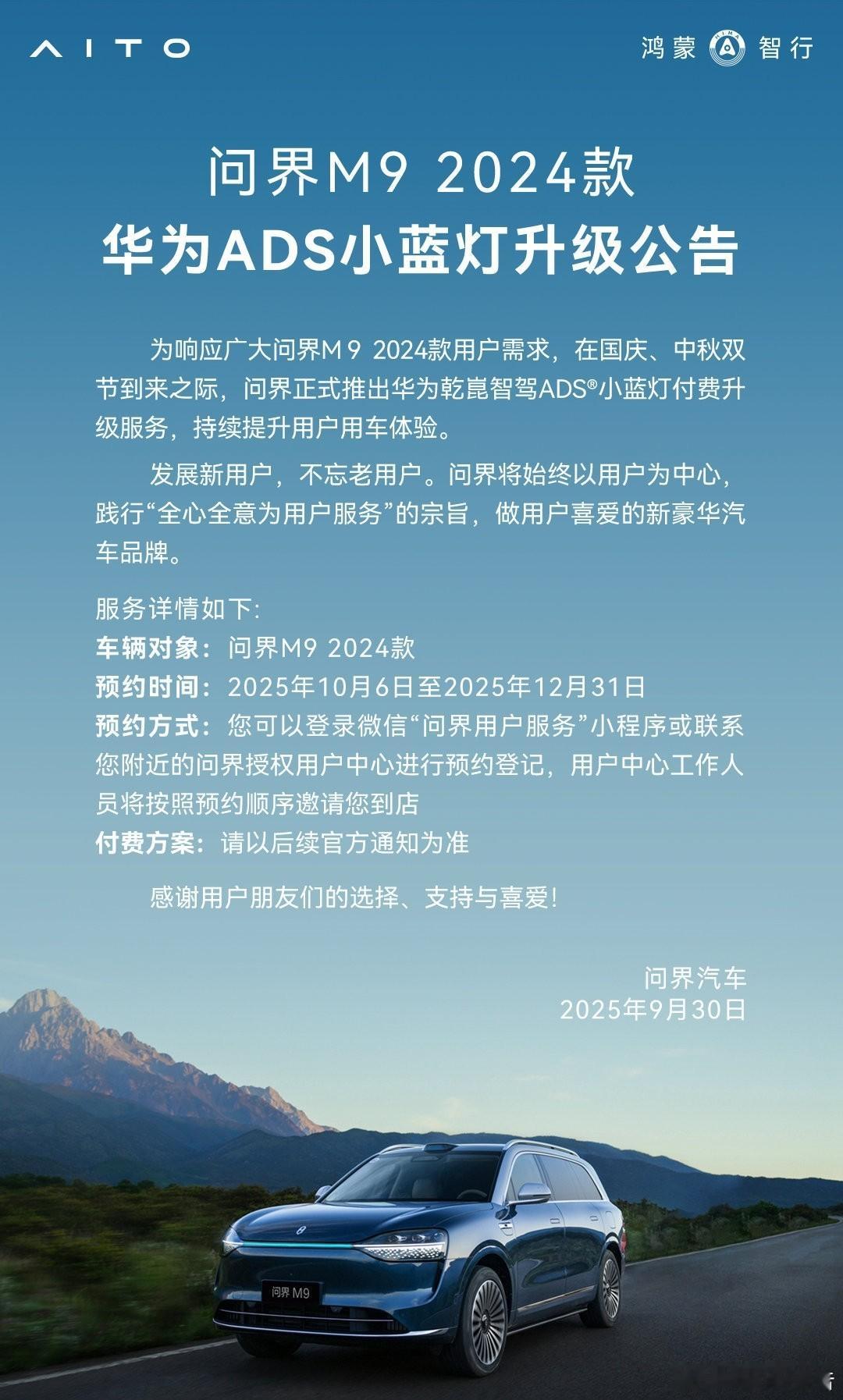 鸿蒙智行公告,10月6日起至年底,2024款问界M9可预约升级“智驾小蓝灯”。限时优惠价7500元需回收原车前后大灯及尾灯,保留旧灯则收15000元,官方未公布具体费用。