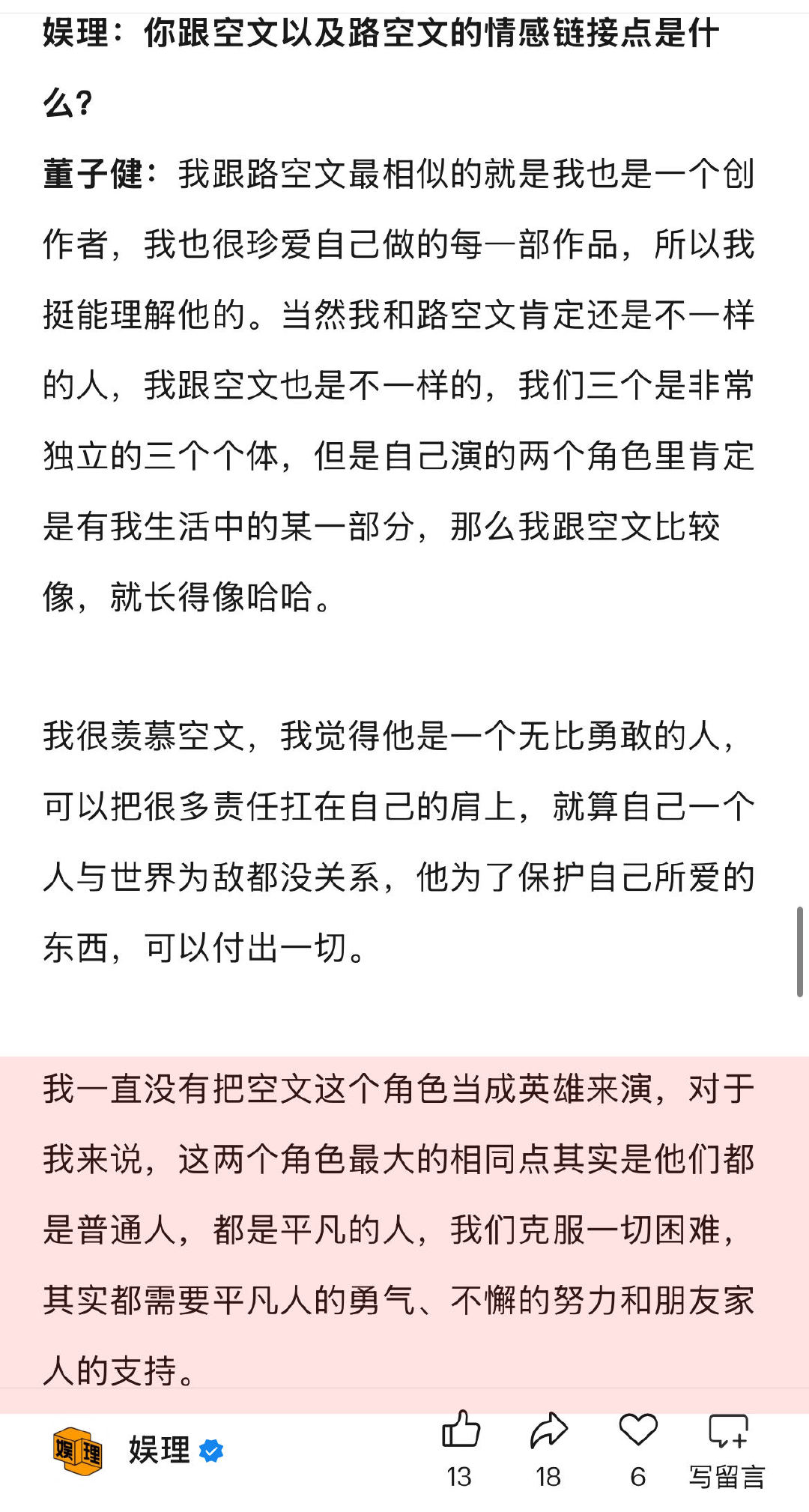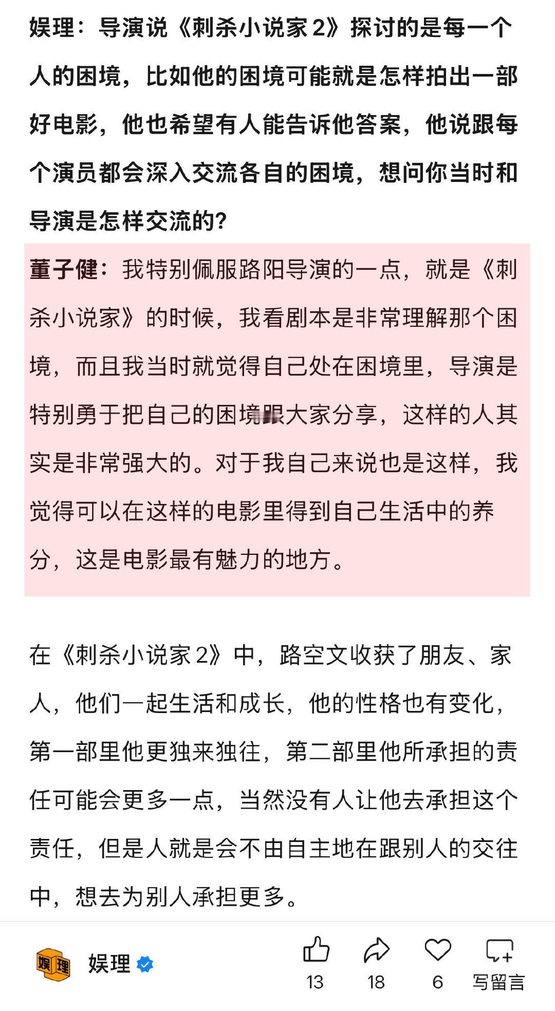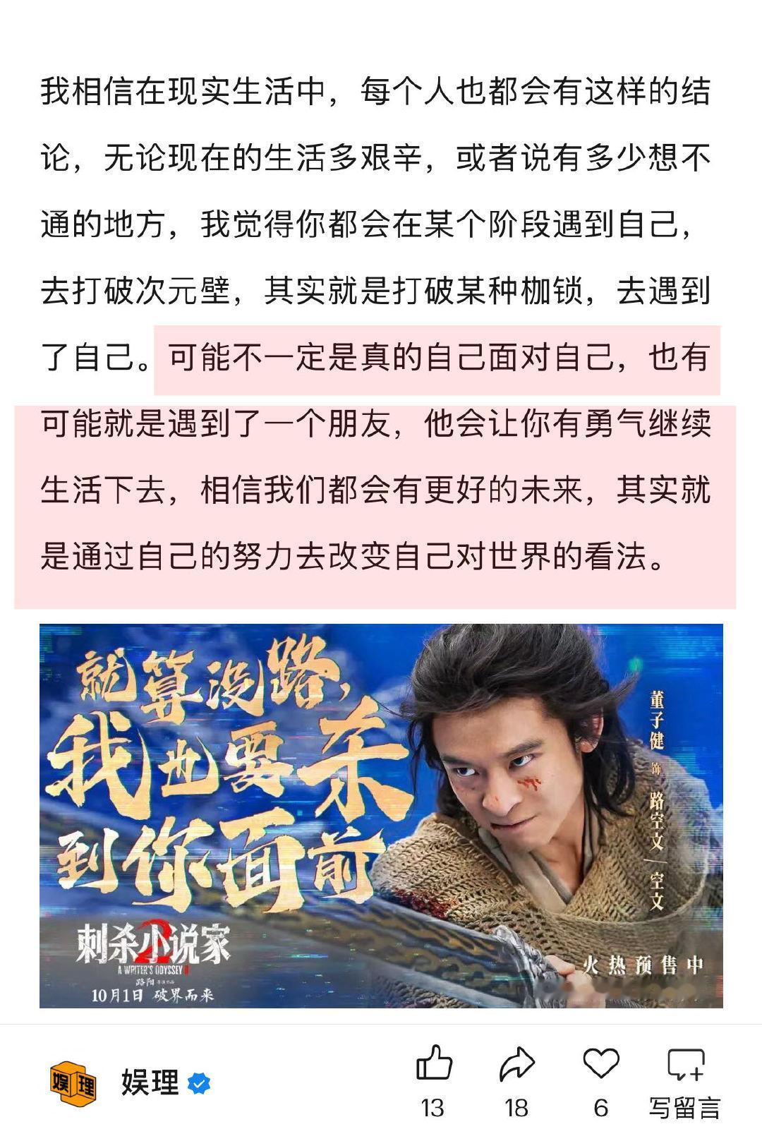 董子健说挺佩服丁程鑫的 董子健说演张震儿子压力非常大 时隔六年再次回到《刺杀小说家》的世界,董子健直言自己肯定是有变化的,“岁数变大了,褶子变多了。但是挺亲切能回到《刺杀小说家》的世界…因为这次整个的风格跟第一部有非常不一样的地方,所以自己也在想象,路空文这个角色在这几年中到底发生了什么。”娱理独家↓