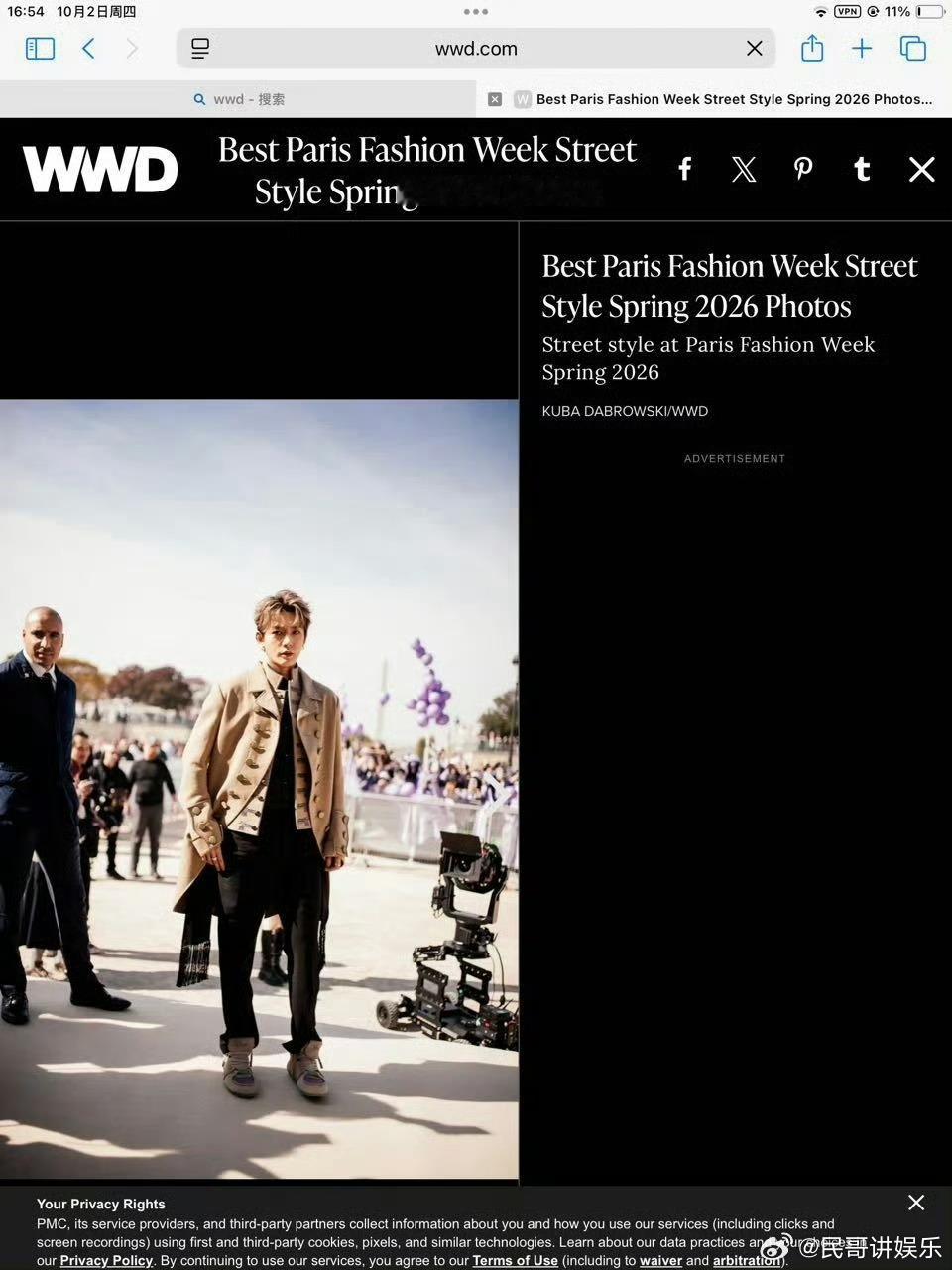 邓为入选26巴黎时装周最佳街拍WWD用镜头定格高光!他以挑染发型搭配Dior新