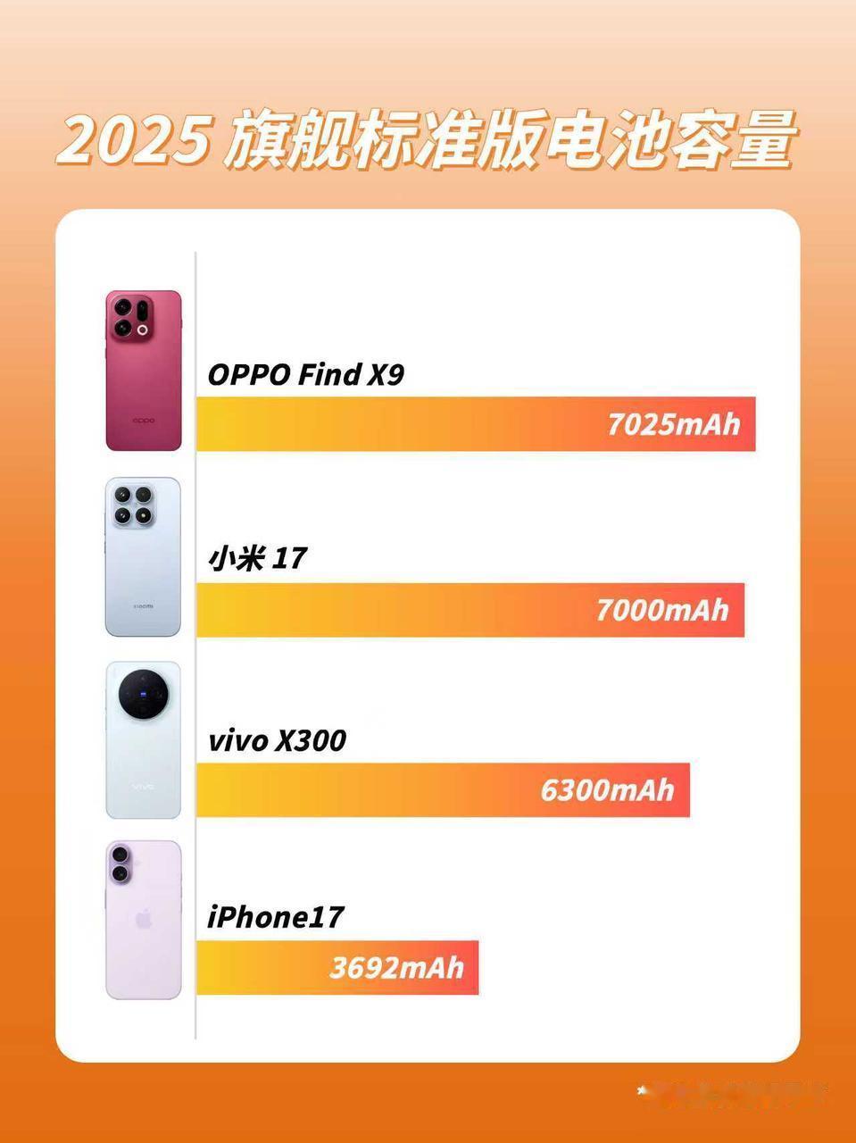 2025下半年新手机电池居然提升这么猛!! 作为一个朝九晚七的打工人,真的太怕手机不耐用了😩 每天上下班通勤刷剧、午休刷短视频、下班回家还要打两把游戏, 一天动不动就两充以上简直心累。 最近准备换新机,第一件事就是先翻电池榜,没想到2025下半年各家旗舰电池容量都在集体猛涨! 连一贯在这方面抠抠搜搜的苹果,最新的iPhone17 Pro Max电池都快到5000mAh了👍。 而安卓这边更是火力全开,即便是标准版机型也都冲上7000mAh档位 比如:OPPO Find X9(7025mAh)、小米17(7000mAh) 特别是OPPO Find X9 Pro更是夸张地塞入了7500mAh 平时地铁上刷剧、午休打游戏都不慌,回家还有电,轻度使用估计都能撑两天!! 再加上机身还做到挺轻薄的,而且OPPO在影像和系统上口碑一直不错, 这代Find X9系列好像真的找不到短板了!! 接下来就看10.16发布价格如何了~ 手机续航 OPPOFindX9 iPhone17 新机爆料 打工人必备 大电池手机 数码分享 小米17