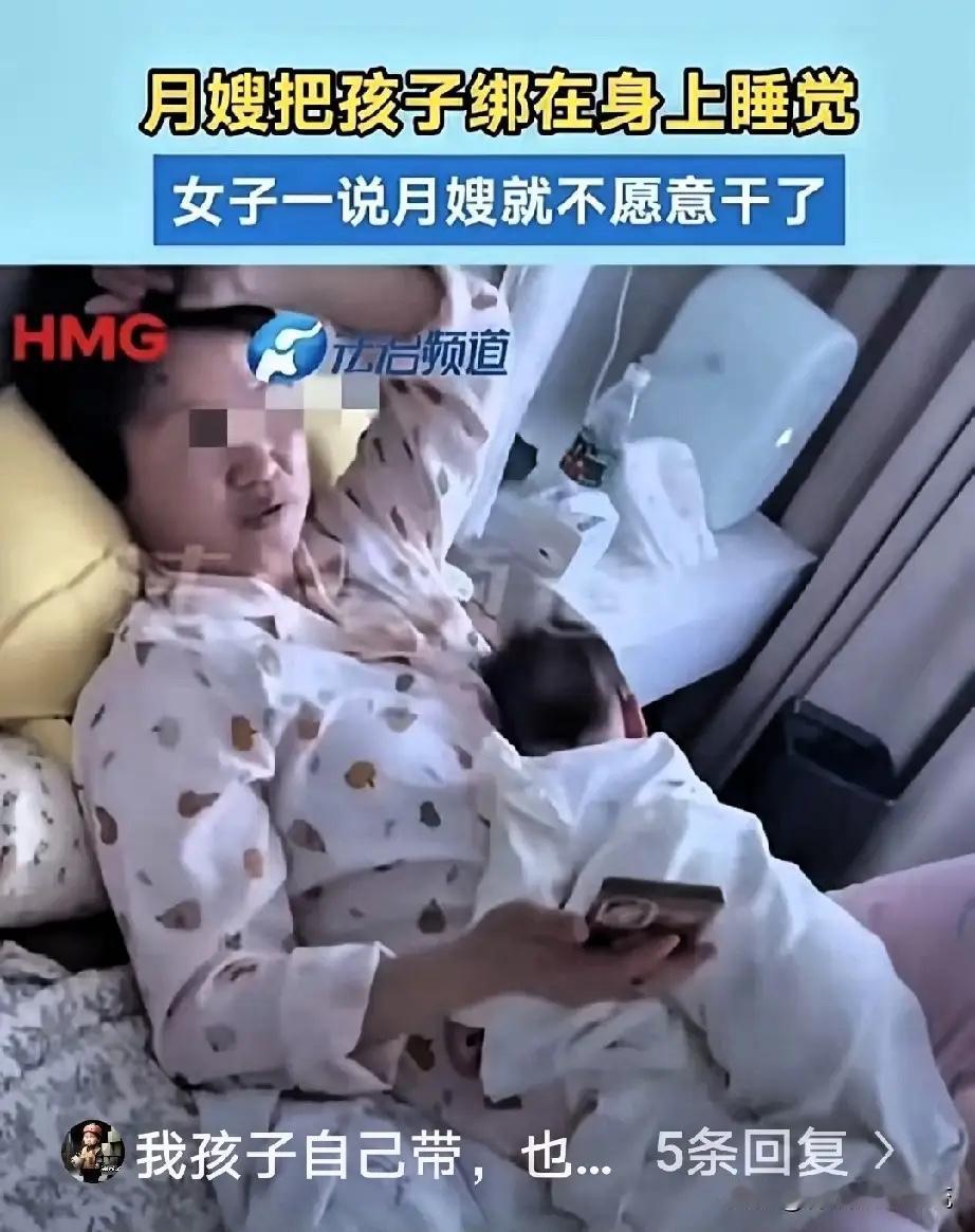 女子发现请的月嫂居然多次把孩子放在自己身上睡,气冲冲的质问她:“你就是抱着孩子看手机吧!”没想到月嫂居然一脸轻蔑的反问:“难道你能把孩子放下去吗?” 网友评论: 自己的孩子自己都不愿意亲自带,人家只是来挣钱的,说职业道德的,低头看看自己的职业道德,母亲也是职业更是职责! 月嫂在培训时就严格要求,带孩子时不能玩手机!这个月嫂不行,早点辞退!以免孩子出问题! 能把婴儿抱着睡的月嫂是负责任的,大人有体温,婴儿有安全感,是个好月嫂。 我外孙女从生下来睡觉就不好,放不下,抱着睡是必须的。放下就醒能咋办?到了百天以后就好了。 能找到这样负责的月嫂已经很不错了,换作你做月嫂你能做到吗?