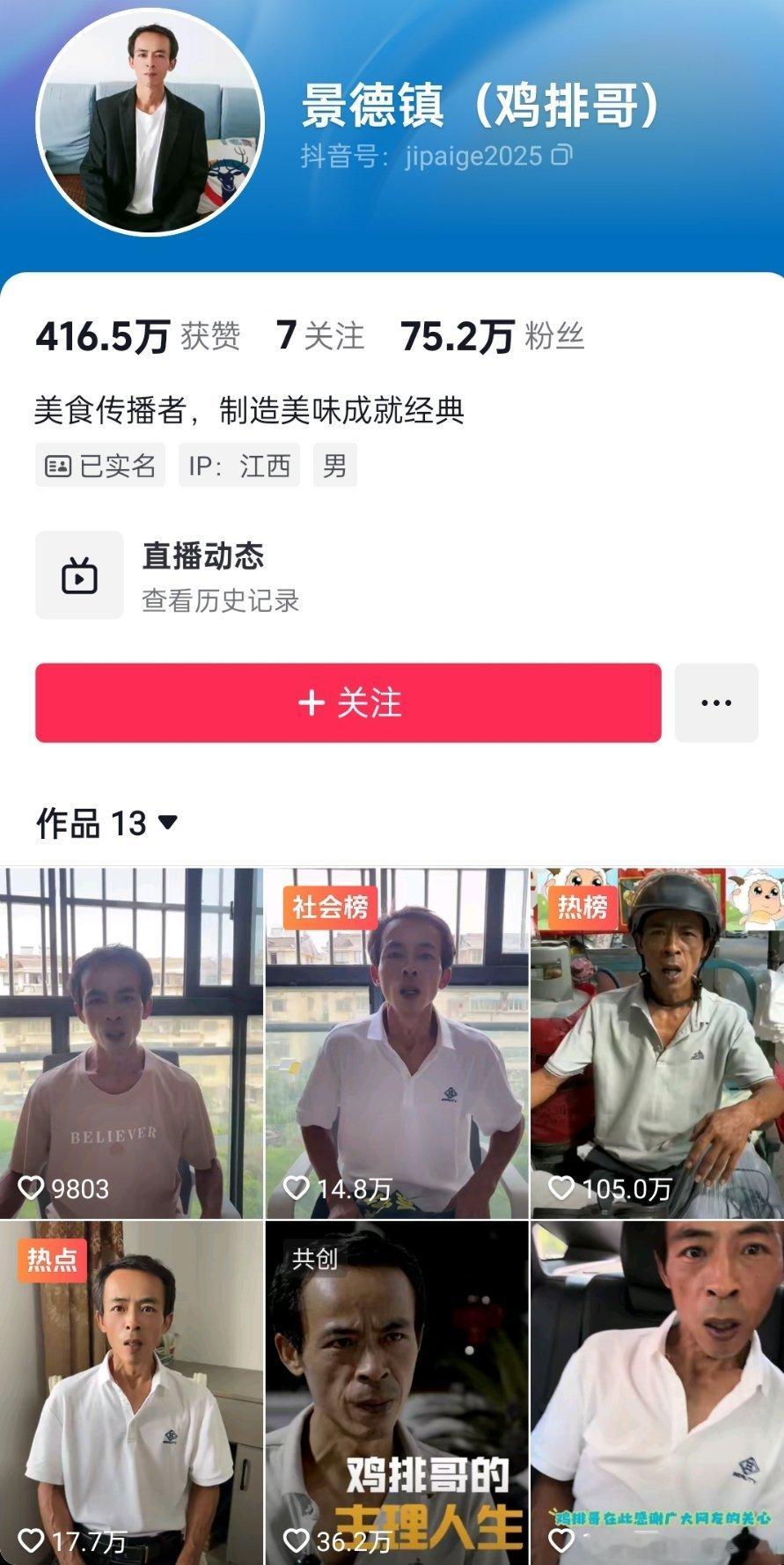 有网友3年前预测鸡排哥将成顶流🔻景德镇鸡排哥社交账号10天涨粉67万。