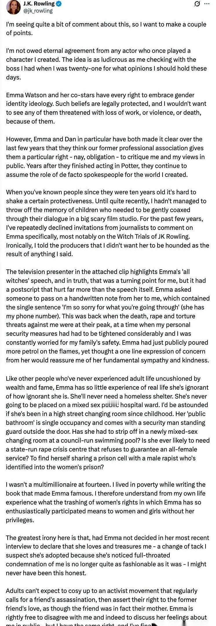 J.K.罗琳这事儿,真是越来越好看了。 当初急着跟她切割的“哈利·波特”主演们,现在一个个都想往回找补。 结果罗琳根本不给面子,直接说:你们的道歉我不需要,去跟那些被你们伤害的女性和孩子说吧。 想当初,罗琳只是坚持男女生理有别,质疑了一下“有月经的人”这种新潮说法,就被打成了“全民公敌”。丹尼尔和艾玛这些主角,立马跳出来表忠心,说“跨性别女性就是女性”,生怕站错队影响了自己的星途。 反倒是电影里的“伏地魔”和“贝拉特里克斯”这些反派演员,还敢站出来说句公道话,批评对罗琳的网络围攻太过了,这事儿本身就够讽刺的。 现在风向为什么变了?因为英国官方出了一份叫《卡斯报告》的东西。这份报告花了四年时间调查,结论就是给小孩做性别改造手术的证据基础很薄弱,需要极其谨慎。这等于直接给罗琳几年前的担忧,盖了个官方认证的章。 所以罗琳现在硬气得很,她不是在闹小脾气。在她看来,这不是私人恩怨,是原则问题。那些明星当初利用自己的影响力,为一场可能伤害女性和儿童的运动站台,现在看势头不对就想道歉了事,天底下哪有这么便宜的事。 罗琳压根不想当他们重塑人设的工具。 这种坚持,值得佩服。