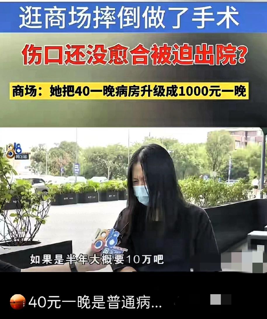 女士逛商场摔倒后, 住院病房从40元升到1000元, 你想要维权没错, 但是别把“理”作没了。 杭州商场这起摔倒纠纷,越看越拧巴——轩女士说地面积水滑倒,商场先承诺担责又断付费;商场说垫了2万还被要求16万赔偿,40元病房被私自升成1000元。 其实大家都懂,消费者受伤要赔偿天经地义,可“维权”和“过度”就隔了条线。 医生说这情况能出院,人家偏偏就不出,没医嘱要求自己就升高级病房,要16万却拿不出伤残报告,这哪是讨公道,更像趁机会“狮子大开口”。 商场的安全保障义务也跑不了,地面积水没清、没设警示,这些都得有监控说话,不能光说自己“负责任”。 维权的底气从来不是“闹”,是证据——商场的监控、医院的单据、赔偿的依据,缺一样都站不住脚。这事您怎么看。