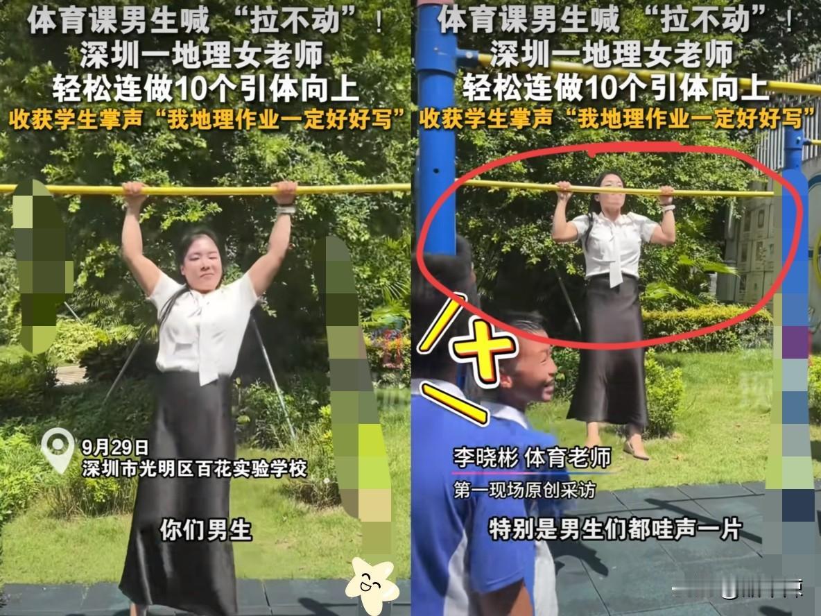 这下瞒不住了,不仅学生知道了, 老师家长都知道了! 深圳一所中学的体育课上,一群学生围着单杠唉声叹气! 直呼引体向上“根本不可能做到”,结果路过的地理老师直接撸起袖子上前,手一握、腰一发力,轻轻松松就完成了10个,当场把学生们看愣了! 别光顾着惊叹老师“深藏不露”,这事儿其实戳中了很多人锻炼的通病,总把“太难了”挂嘴边,却从没真正动起来! 要知道,引体向上考验的心肺功能、手臂力量和背部肌肉,可不是靠空想就能练出来的,老师这一身力气,分明是平时坚持锻炼攒下的“硬实力”! 比起反复说教“要坚持运动”,老师这波“现场露一手”才更有说服力! 学生们亲眼看着平时文静的老师做到了,自然没理由再找借口,这就是“身教”永远比“言传”更打动人的地方! 大家说是不是这个理?