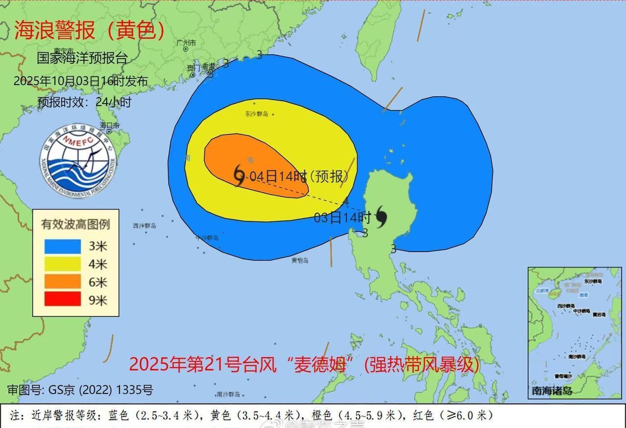 拉响海浪黄色警报】记者从自然资源部获悉,今年第21号台风“麦德姆”(强热带风暴级)的中心今天(3日)下午14时位于菲律宾吕宋岛境内。预计“麦德姆” 将以每小时25-30公里的速度向西偏北方向移入南海东部海面,逐渐向广东西部到海南岛东部一带沿海靠近,强度逐渐增强,最强可达强台风级,将于5日白天在上述沿海登陆。 国家海洋预报台3日发布海浪黄色警报。受今年第21号台风“麦德姆”的影响,预计10月4日上午到下午,南海北部将出现5到8米的巨浪到狂浪区,近海海域海浪预警级别为黄色;广东东部近岸海域将出现2到3米的中浪到大浪,近岸海域海浪预警级别为蓝色。 风暴潮方面,预计10月4日夜间至6日白天,广东西部、海南和广西沿海将先后出现一次较强的台风风暴潮过程。