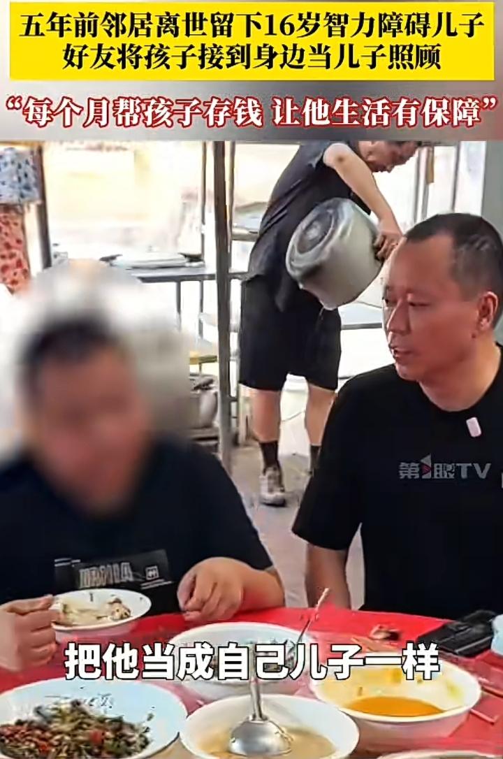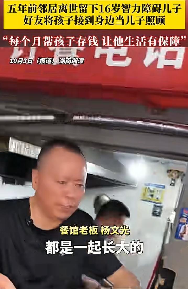 餐馆老板杨文光说:和自己一起长大的邻居在2020年去世了,留下他一个未成年的儿子,而且有后遗症16岁了只有5.6岁的智商,这个是先天性的谁也没办法,邻居以前托付他如果自己有什么不测,希望他能照顾一下自己的孩子,老杨一个劲的点头没有讲话。 转眼过去5年了,目前这个孩子在老杨的餐馆帮忙,经过这几年的历练他已经可以自己照顾自己,会自己做饭也能在餐馆切菜洗菜,自己每个月都帮他存一点钱,再加入他的低保生活不是问题,对于邻居的托付他说会把这个孩子当成自己的儿子一样照顾,附近人知道了这个消息也纷纷前来照顾他的生意,目前一切安好,自己会尽最大的努力来照顾这个孩子。 中国好邻居,能视如己出的照顾邻居的孩子,而且还是一名有障碍的孩子,只能说这杨先生大义,希望他的餐馆生意蒸蒸日上,永远的客患满盈,好心人一生平安。