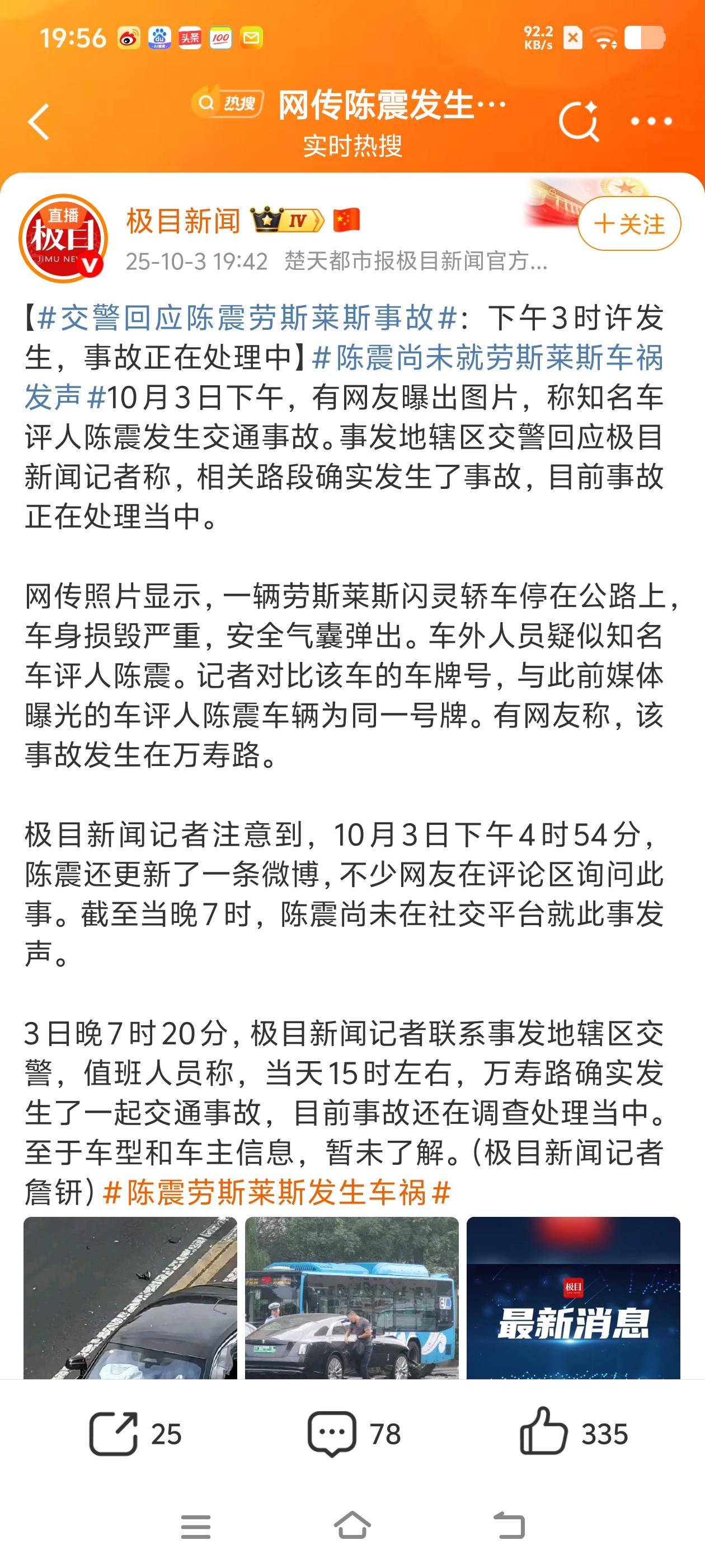 这大过节的,人没事就好,对方人没事更好,这车子才值几个钱,虽然是劳斯莱斯,但是,毕竟是个新能源汽车! 事故原因正在调查之中,事发之后看着陈震挺冷静的。