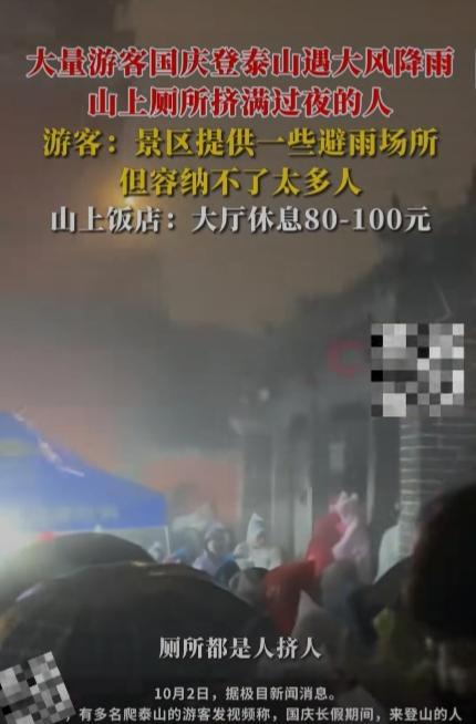 国庆期间大量游客在泰山遇到大风降雨天气,就连山上的厕所都挤满了过夜的人,游客回应