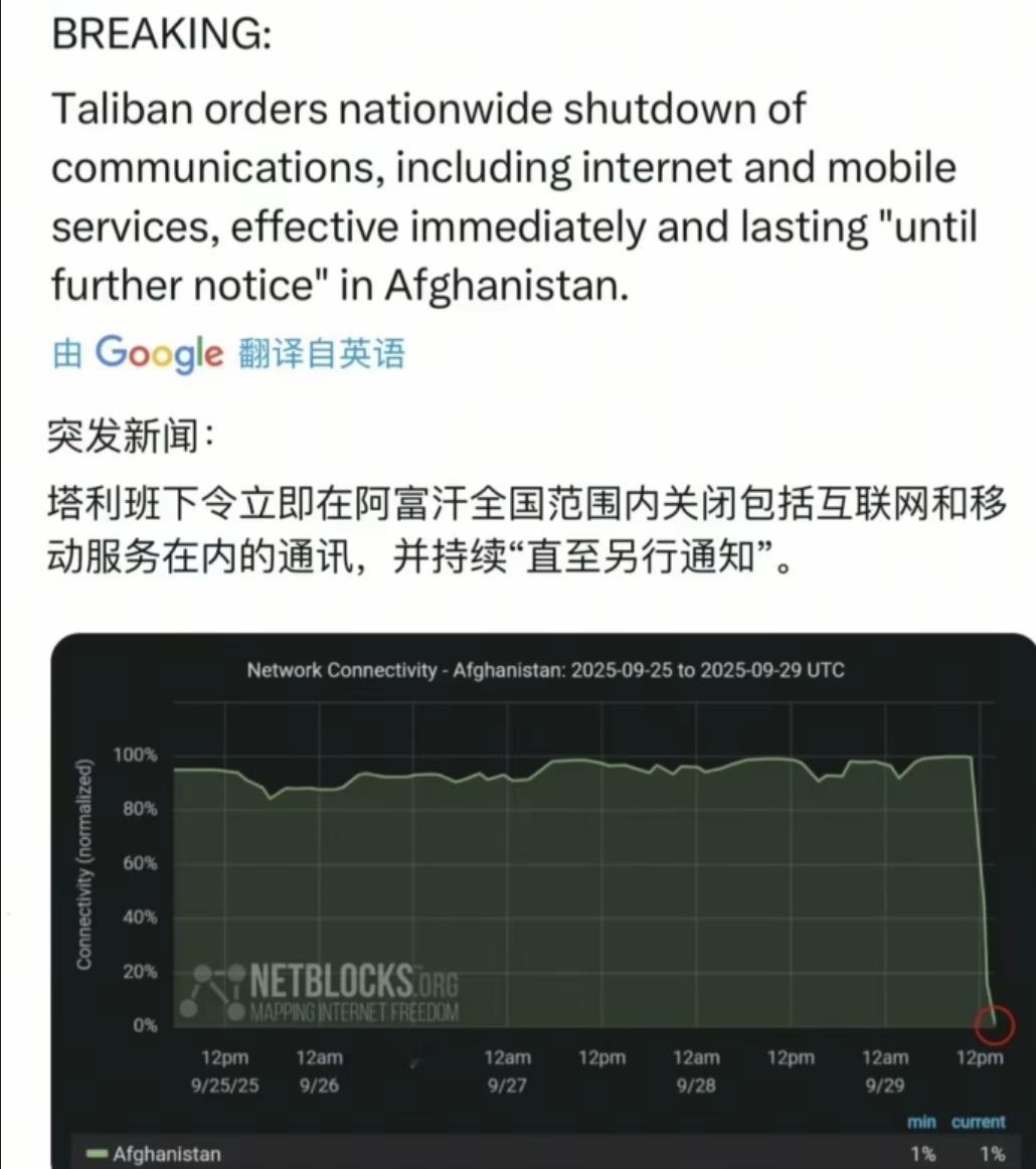 塔利班是一群狠人!断网断电硬刚美国! 之前阿富汗就出过全国性停电,城市一下子陷入24小时的黑暗里,那场面想想都觉得压抑。可这次更绝,不光是电,覆盖4300多万人的通信网络也被一刀切断了。 这可不是啥技术故障,就是塔利班故意干的,精准切断光纤网络,让整个国家的通信瞬间瘫痪。要知道在阿富汗,光纤和电话系统是绑在一起的,网一断,电话也成了摆设,打都打不通。 这一下可把阿富汗的命脉给掐住了。本来阿富汗的电力系统就弱得不行,七成以上的电都得从乌兹别克斯坦进口,现在电和网全断,内外联系彻底断了,连喀布尔的机场都因为没网。 所有航班都取消了,整个国家就像变成了一座孤立的岛,不管是现实里还是数字世界里,都跟外界隔离开了。 其实塔利班干这种事儿也不是头一回了。2021年的时候,他们就精准切断过潘杰希尔省的网络,就是为了不让反抗的声音传出去;2019年还炸过巴格兰省的输电塔,让12个省份都黑了。 这次倒好,直接把之前的两套办法合在一起用,而且是在全国范围内搞,狠劲儿比以前更足了。 做生意的人彻底跟客户、供应商断了联系,生意根本做不下去,粮食和农产品都运不出去,供应链眼看就要断了。 喀布尔东部的工业园里,机器都停了,没一点声响;街头卖冰激凌的哈利利,因为没发电机给冰柜供电,直接就失业了,以后咋生活都不知道。 家里的情况也好不到哪去,一个个都成了信息孤岛。有个叫穆罕默德的男人,再也打不通远方亲人的电话,不知道家里人好不好;那些靠在线课程学习的女孩,唯一的学习路子也没了,只能在家干着急。 街上到处都是焦急的人,大家都在打听消息,可也没啥用,原本的生活节奏全被打乱了。 面对这一切,塔利班官方说得倒挺轻松,巴尔赫省的发言人哈吉·扎伊德说,这是最高领导人下的令,是为了防止“不道德活动”和“有害信息”传播,还说会搞个“替代系统”。、 可谁知道这系统是什么样,要等多久,根本就是空话。 明眼人都知道,这背后都是地缘政治的算计。之前美国前总统特朗普说要重返阿富汗的军事基地,比如那个77平方公里的巴格拉姆基地。 塔利班这次断网断电,就是冲着这话来的,明摆着是跟美国叫板。 说白了,这就是塔利班的一种博弈手段。他们就是要让美国和全世界看看,自己能完全控制阿富汗的关键基础设施。故意把通信和电力弄瘫痪,让外面的军事力量想进来的话,后勤保障和行动协调都难上加难。 这种用“落后”对抗“先进”的法子,就是想让特朗普“重返基地”的话变成空谈。 对内,他们能在没有信息干扰的情况下巩固自己的权力,不让反对的声音联合起来;对外,就是明确告诉所有人,阿富汗现在谁说了算,游戏规则已经变了。 塔利班这波操作,虽然够狠,硬刚美国的态度很坚决,但最终受苦的还是阿富汗老百姓。不管是出于啥目的,拿民众的生活当筹码,总归不是啥光彩的事儿。