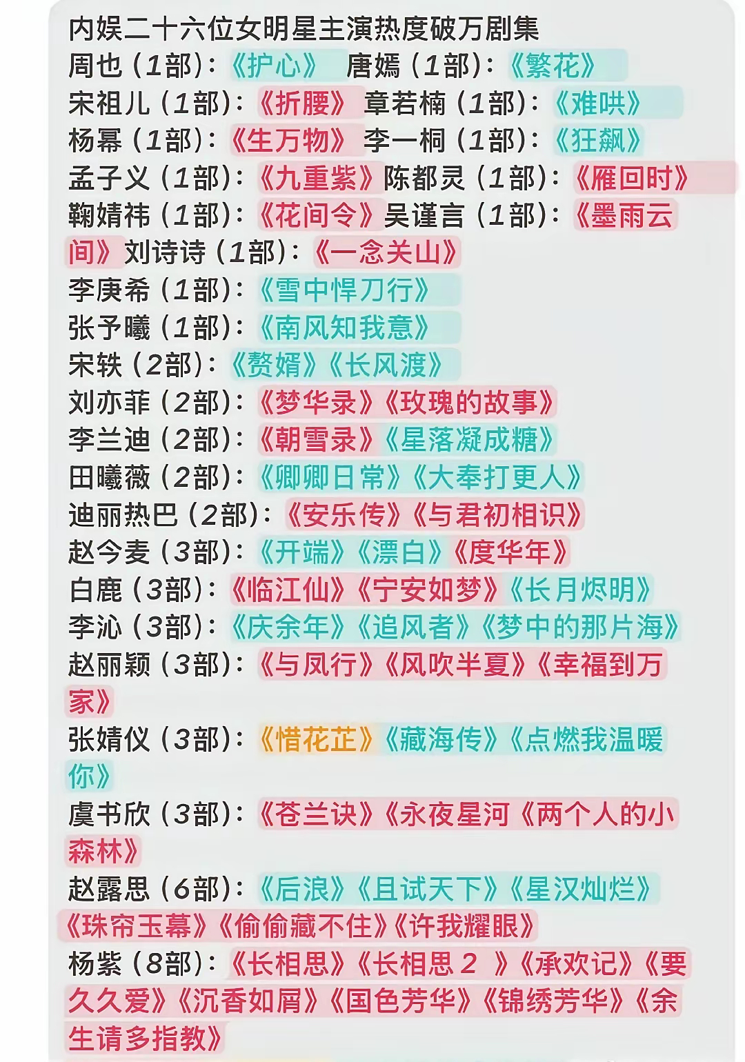 内娱26位女明星主演热度破万剧集🈶杨紫8个,赵露思6个,虞书欣3个,张婧仪3个