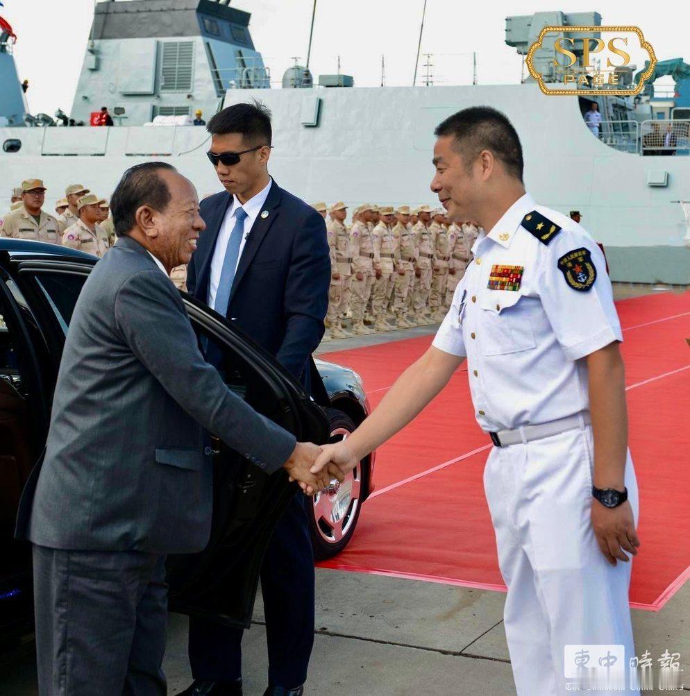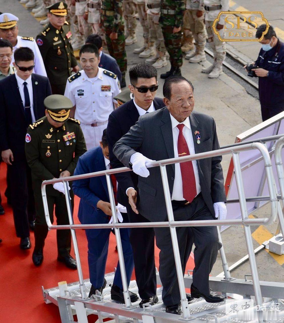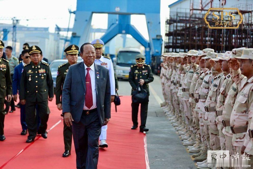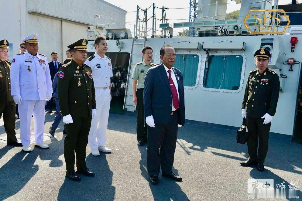 狄班发布的照片显示,副总理兼国防部长狄西哈、海军司令狄速卡等多名柬埔寨高级军官亦随团视察。