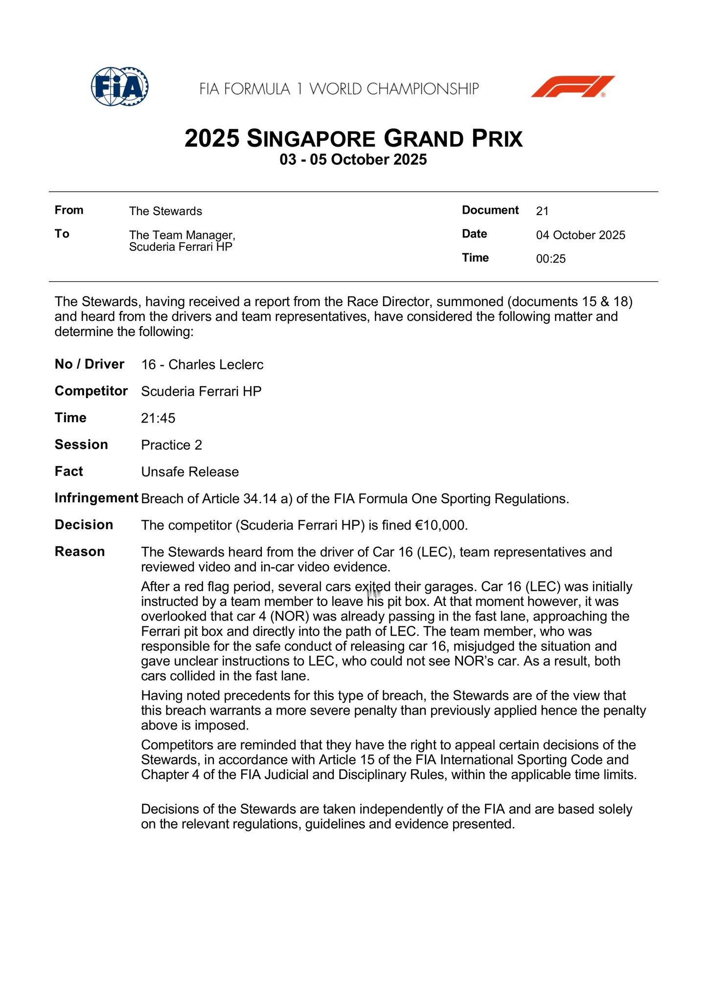 法拉利车队因为不安全释放,被罚款10000欧元