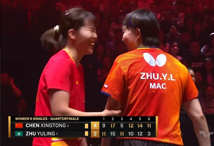 10月3日中国大满贯陈幸同4—2朱雨玲之后两人握手热聊,朱雨玲还和马俊峰教练握手