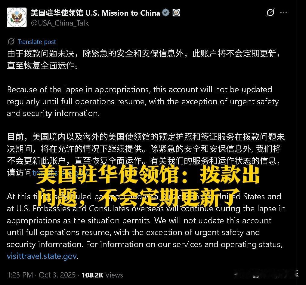 美国驻华使领馆:拨款出问题,不会定期更新了 据外媒报道北京时间10月3日