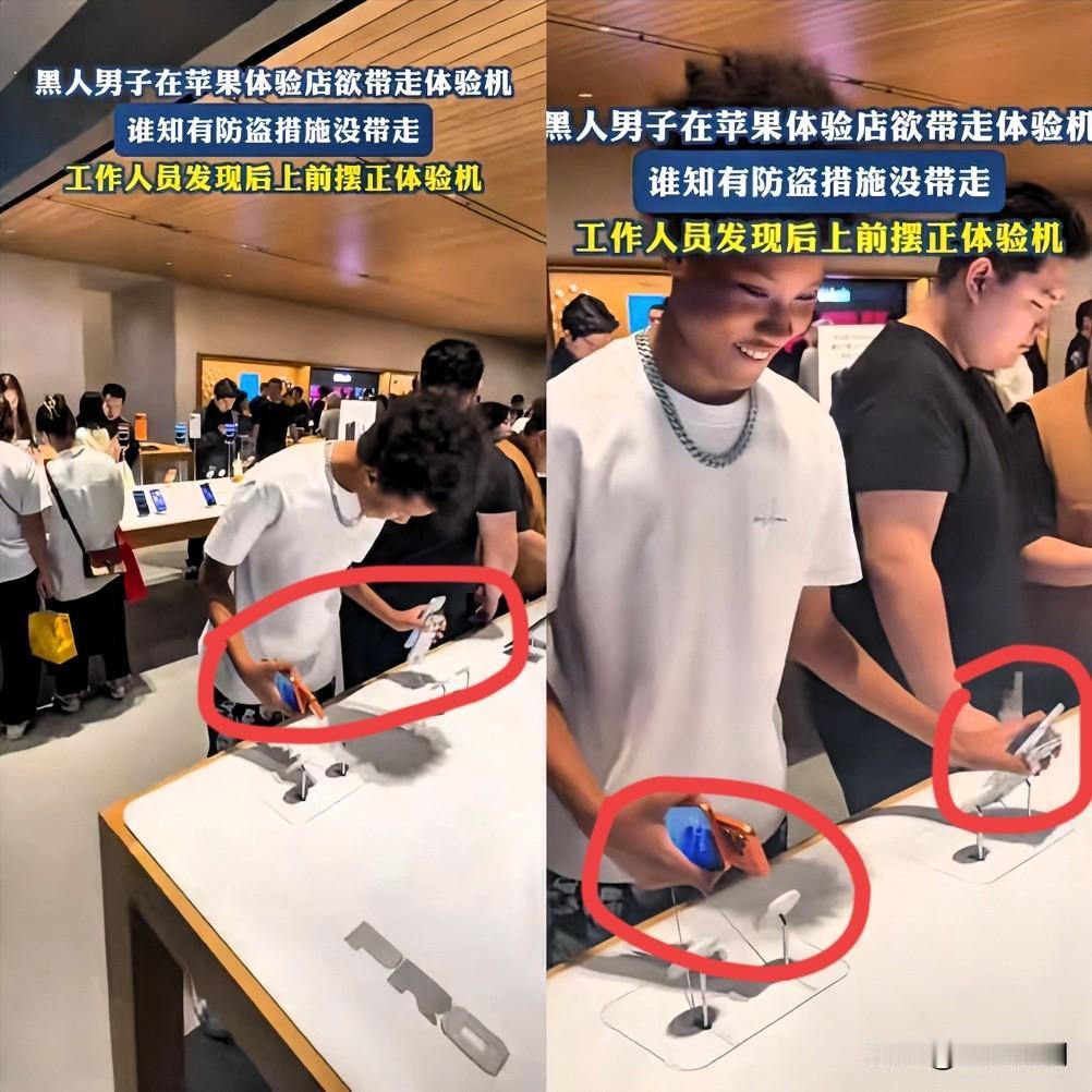 骨子里的零元购基因 俩黑人小伙在商场苹果柜台的操作, 看完真让人无语,穿白衣服的直接双手攥着4台样机往怀里带。 还好机子有防盗锁没被扯走,穿黑衣服的不仅不拦着,还跟同伴一起对着上前制止的店员笑,那模样哪儿像做错事,倒像是在玩闹。 其实店员早看出不对劲了 这俩人一进店就死盯着手机柜台, 眼神里那股子贪劲儿藏都藏不住,还对着屏幕嘿嘿笑,换谁都得多留个心眼。 最后店员没拆穿,只是把手机扶正,已经给足了体面。 有人说咱对这类行为包容度太高,我倒觉得,包容得有底线。不是说不能给陌生人善意,但拿着别人的客气当“空子”钻,就不是小事了。 要是这次没被及时制止,下次会不会有更过分的举动? 大家碰到这种“不对劲”的场景时,会选择当场提醒店员,还是先观察情况? 来评论区聊聊你的做法!