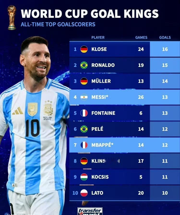 只差3球,梅西明年有机会登顶世界杯历史射手王!近日,《德国转会市场》统计了世