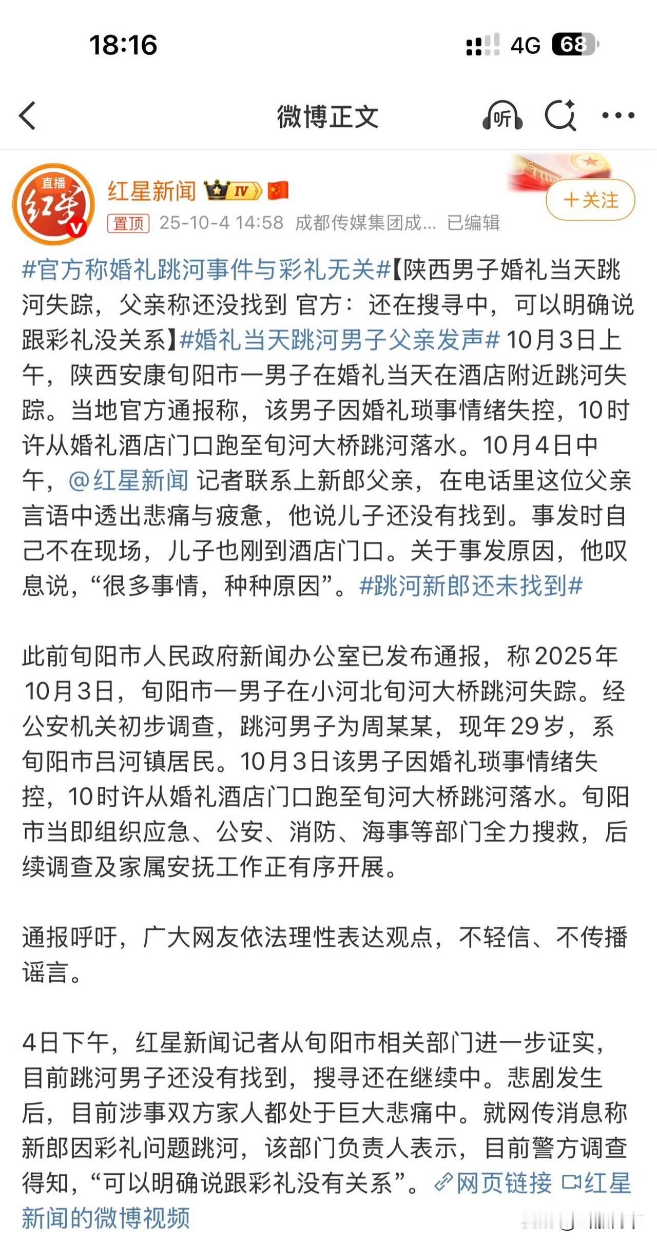 成年人的崩溃有时候真的就在那一瞬间,10月3日,陕西旬阳市一男子在婚礼当天在酒店附近跳河失踪,很多网友猜测新郎是因为彩礼问题跳河,但官方通报是新郎因婚礼琐事情绪失控,有记者联系到新郎的父亲,其父亲表示,儿子现在还没有找到,事发时自己不在现场,儿子也刚到酒店门口,关于事发原因,他叹息说,“很多事情,种种原因”。 网上很多消息说是因为2万的下车费,到底是不是真的还不知晓,谈不拢就不结啊,为什么要跳河,天涯何处无芳草旬阳 新郎跳河