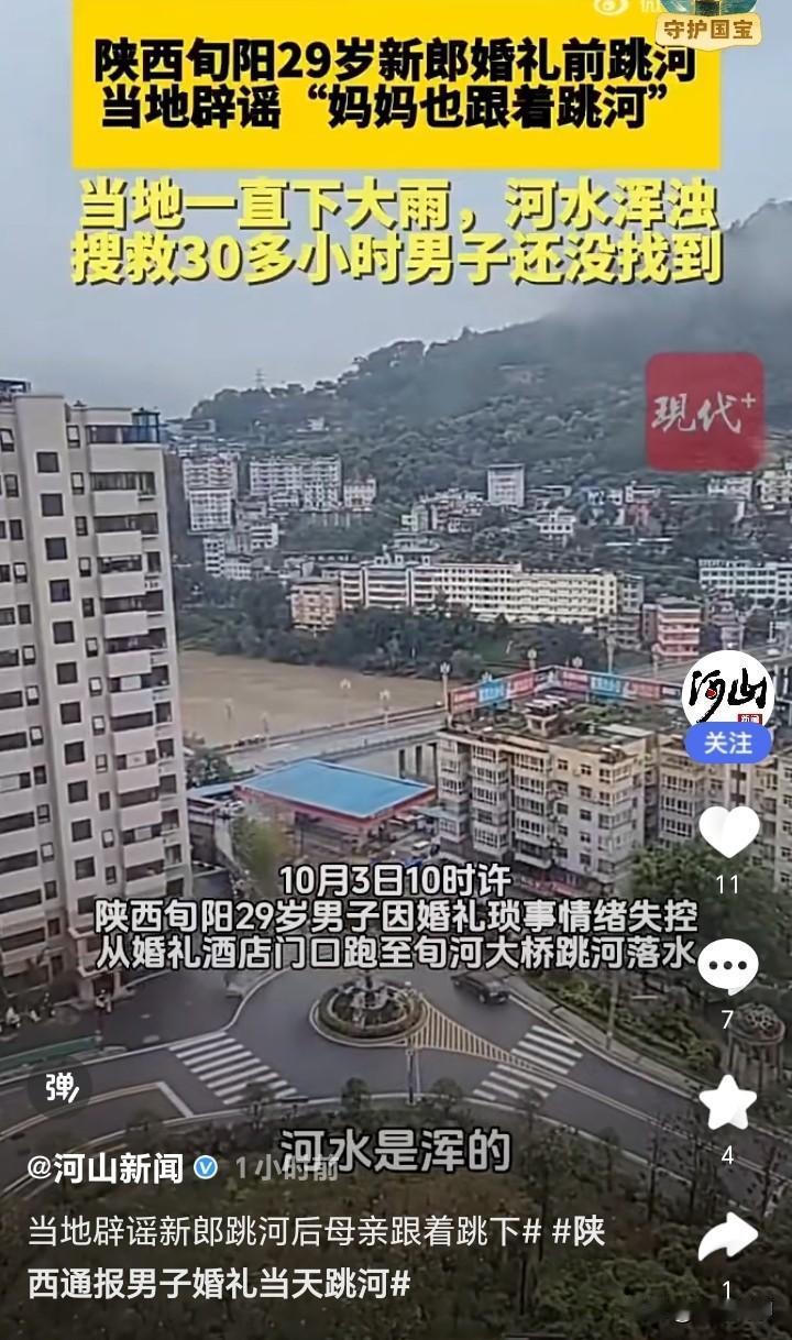 国庆期间举行婚礼本来是一件喜上加喜的事情,可在陕西安康旬阳市却发生一起新郎跳河事件,估计连电视剧都不敢这么拍,事情的起因是婚礼当天,新郎因与新娘为一些琐事发生争执,随后情绪失控,从旬河大桥上跳下,有关部门接到报警后立刻便开始搜救,可截止10月4日依然没有找到,目前新郎已失联超过30小时,情况不容乐观。 到底是什么琐事能让新郎这么想不开,目前得到的消息是跟彩礼没有关系,媒体联系到新郎的父亲,语言中透出悲痛与疲惫,只是说有很多事,种种原因。还有一些键盘侠竟然造谣说新郎妈妈也跳下去了,本来这家人就够痛苦了,为什么还要造这种谣,这种人还有良心吗 ?