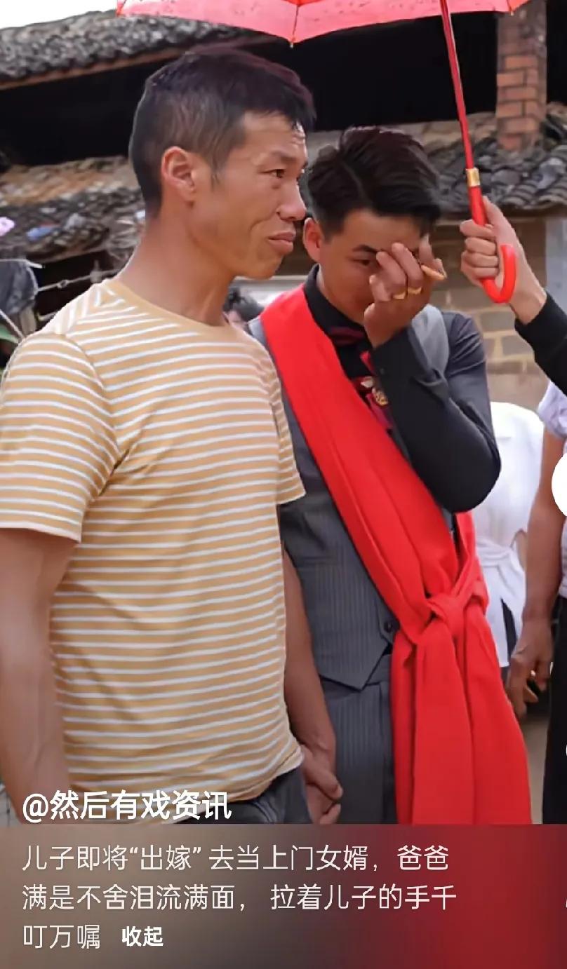儿子当上门女婿告别父亲,父亲满是不舍拉着儿子泪流满面,千叮咛万嘱咐。 原来嫁女儿