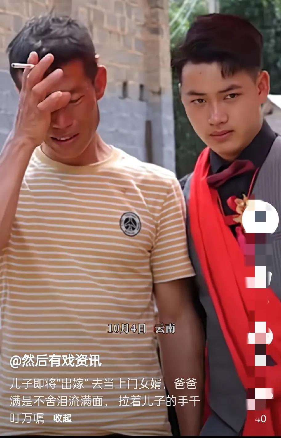 儿子当上门女婿告别父亲,父亲满是不舍拉着儿子泪流满面,千叮咛万嘱咐。 原来嫁女儿嫁儿子都伤心难过啊! 看着小伙子也蛮帅的,眼神里透露出些不甘和无奈,如果不是经济问题,应该也不会入赘,毕竟没人想走这一条捷径。 转念一想,其实上门女婿就是一个偏见。 女人做了几千年的上门媳妇,有几个婆家把媳妇当宝贝了?当上门女婿,父母又不是不认了。只要双方相爱,双方父母通情达理,一家人不说两家话,在哪里生活都一样了。毕竟孩子跟谁姓,都是夫妻俩亲生的。没必要委屈,更没必要不甘!