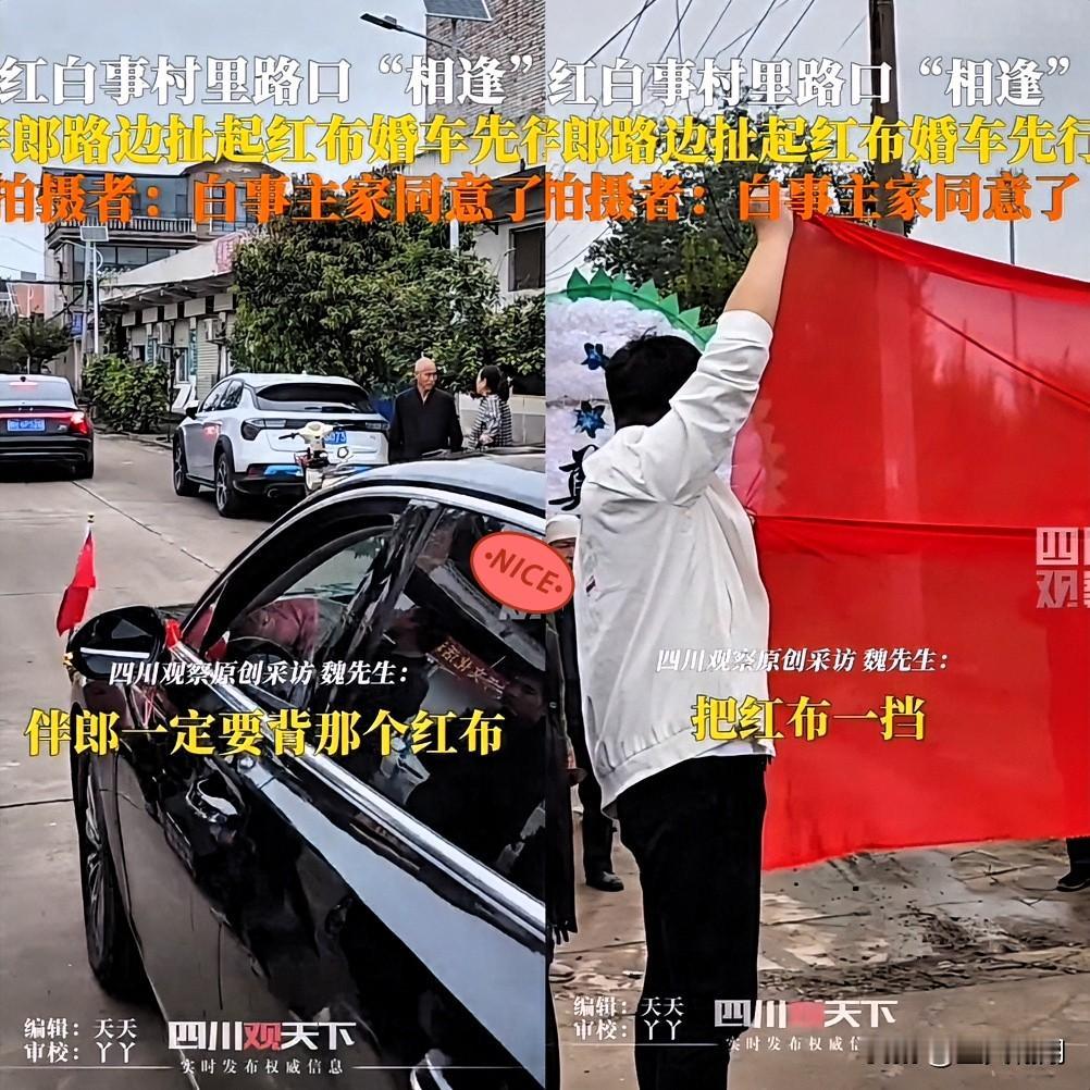 红事碰白事真的晦气? 别瞎猜了,老祖宗的做法藏着大智慧! 河南农村婚车与白事在村口相逢,最后新郎路边扯起红布遮挡让㛰车先走。 白事主家也同意了 有人却喊晦气,说红白对立相冲, 也有人笑称“出门遇丧,事事顺”, 觉得是抢走好运气。 其实哪有那么多吉凶讲究, 核心全在“尊重”二字。 路上让红事是怕新人走回头路, 桥上让白事是懂“奈何桥不等人”, 这些灵活的规矩,不过是给双方一个体面。 所谓的忌讳,更多是心理作用,哪有什么真的冲撞。 生老病死本就是人生常态, 喜悲相遇不过是生活的巧合。 红事的热闹不扰白事的肃穆, 白事的庄重不扫红事的喜气, 这才是最好的相处之道。 你老家遇上这种情况会怎么处理? 来评论区说说~ 农村白事讲究 红白事上门宴席 红事白事 红白事礼仪文化 红白事礼仪 白喜事礼仪 红白事民俗