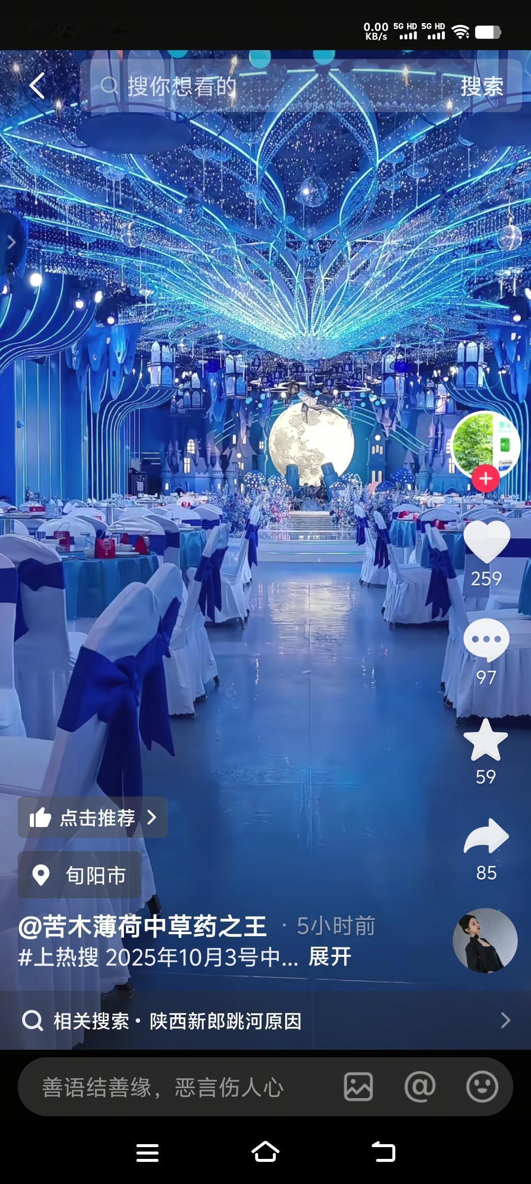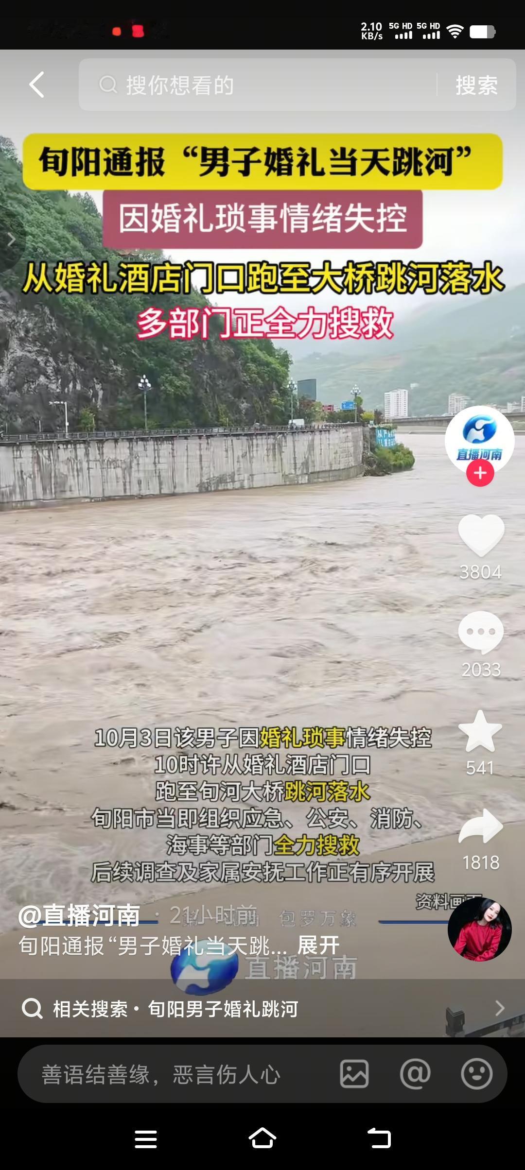 官方通报“可以明确的说跟彩礼没有关系”,男子父亲“很多事情,种种原因”。真是让人感到整件事情扑朔迷离,还有什么比金钱的杀伤力大呢?难道是感情吗? 万达悦华大酒店到旬河大桥仅仅不到500米,男子突然从酒店门口跑向旬河大桥,到底是一时情绪失控还是压抑已久的情绪突然爆发?我们不知道。但有一点可以肯定的是,不到500米的距离,男子丝毫没有犹豫,可以说是抱着必死之心跳河的,可见当时心情是灰暗到了极点,大脑一片空白,只想用死来逃避。 上午10时左右,酒店大厅还没进,如果不出意外的话,应该此时新人站在大厅迎接亲朋好友了。在酒店门口这段时间到底发生了什么?我们无需猜测,也没有猜测的任何意义。因为不管什么原因,都不足以让一个人轻而易举的放弃生命,这不仅是对自己生命的不尊重,而是对父母的一种不负责。死并不可怕,可怕的是儿戏生命。
