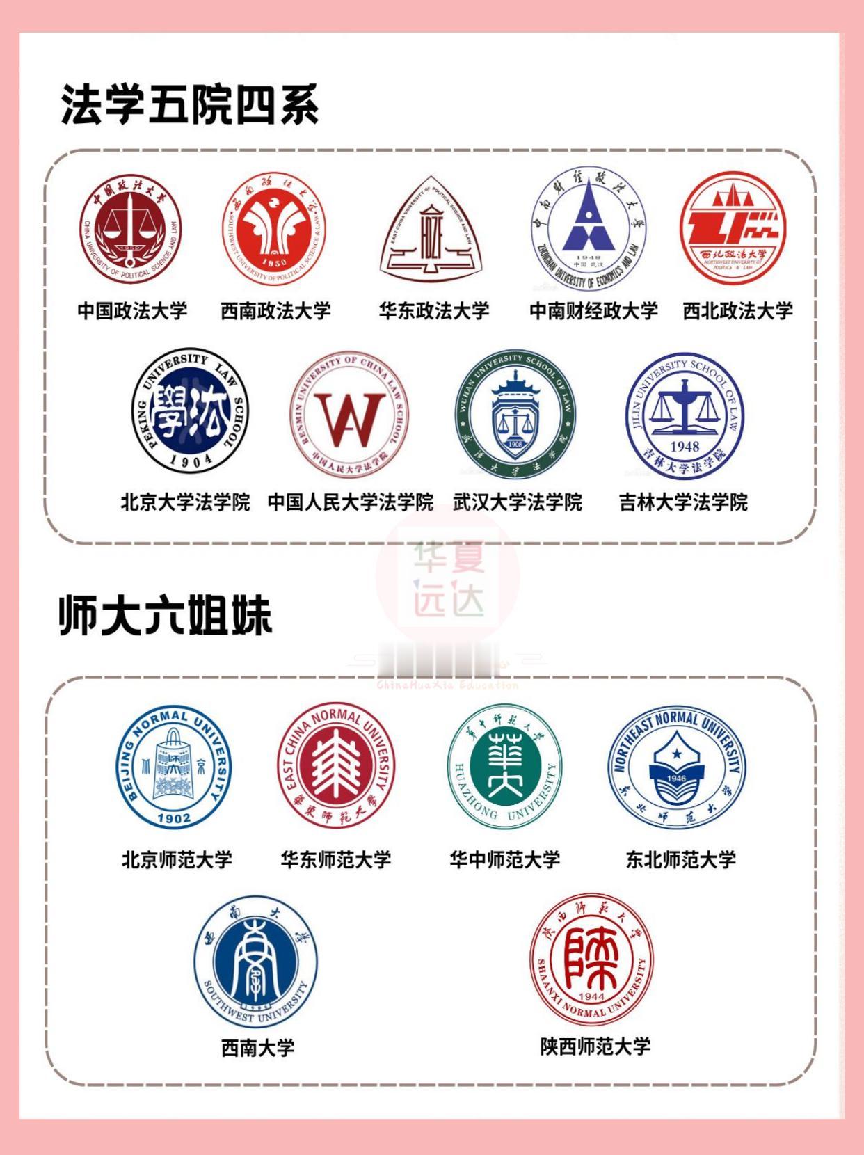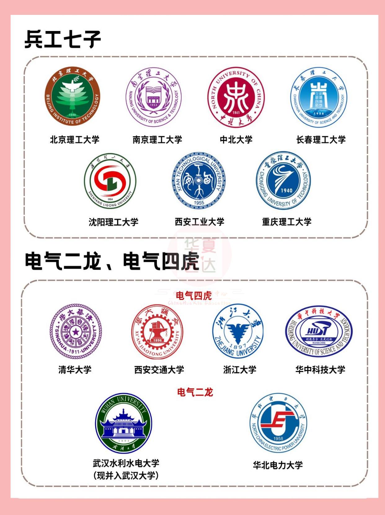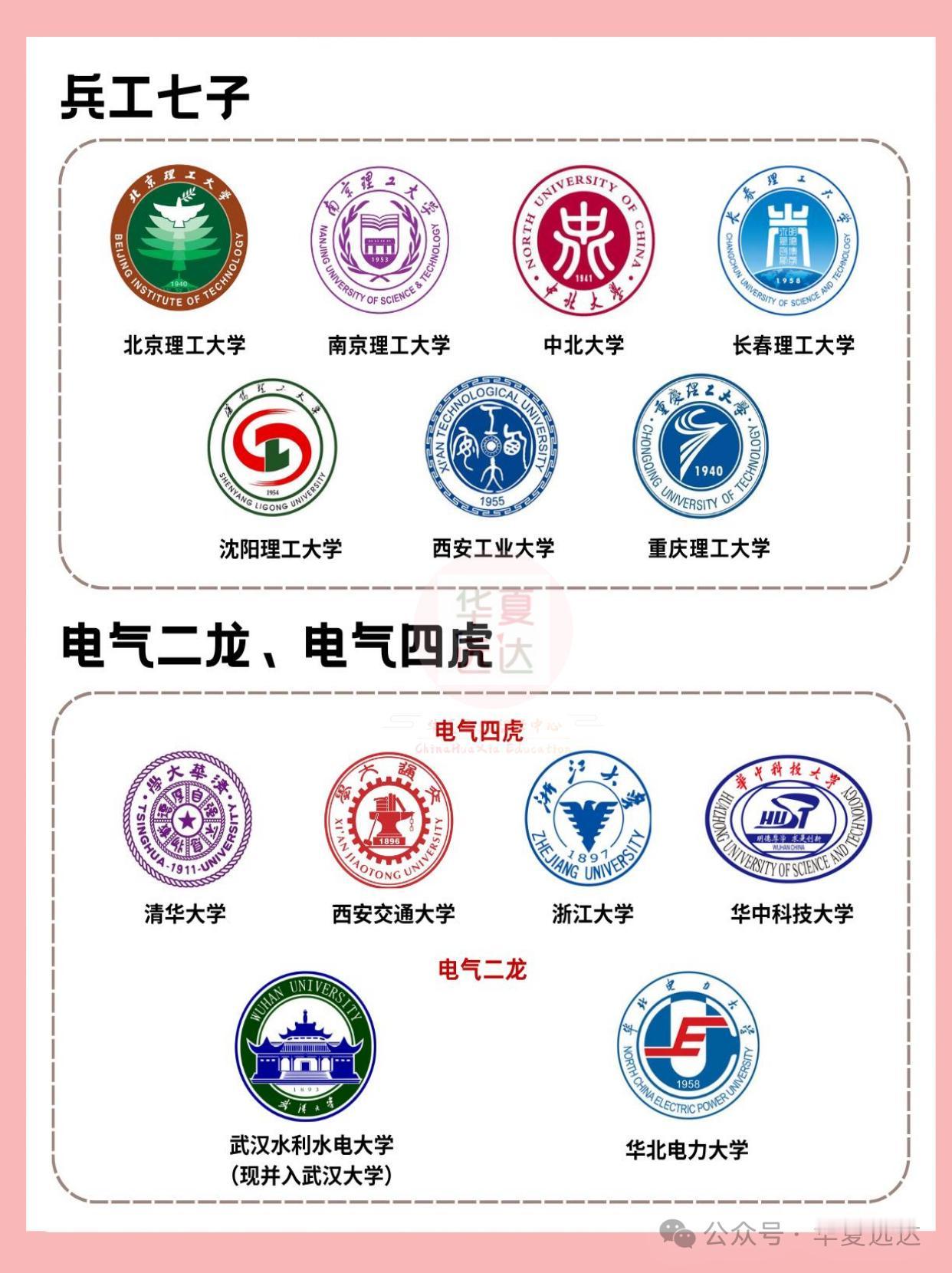 常说的C9/国防七子/ 五院四系…都是啥? 超全标签解读,一看就明白! 在高考择校选专业时,我们经常会看到C9、华五、国防七子、五院四系、二龙四虎...等标签,同学、家长们初遇时可能会一头雾水,你知道这些标签是什么意思吗?分别指哪些大学呢?👇👇 🔍C9联盟 北京大学、清华大学、浙江大学、复旦大学、上海交通大学、南京大学、中国科学技术大学、哈尔滨工业大学、西安交通大学 🔍国防七子 “国防七子”又称“国防七校”:北京航空航天大学、北京理工大学、哈尔滨工业大学、西北工业大学、哈尔滨工程大学、南京航空航天大学、南京理工大学。 “国防七校”是中华人民共和国工业和信息化部直属的七所高校,对我国航空航天和武器制造领域发展有着不可磨灭的贡献。 🔍华东五校 也常被家长们俗称“华东五虎”,指复旦大学、上海交通大学、浙江大学、南京大学、中国科学技术大学 🔍五院四系 五院指:中国政法大学、西南政法大学、华东政法大学、中南财经政法大学、西北政法大学。 四系现已发展为:北京大学法学院、中国人民大学法学院、武汉大学法学院、吉林大学法学院。 🔍二龙四虎 二龙指:华北电力大学和原武汉水利电力大学(已并入武汉大学) 四虎包括:清华大学、西安交通大学、浙江大学、华中科技大学 🔍五大财经院校 中央财经大学、上海财经大学、对外经济贸易大学、西南财经大学、中南财经政法大学。 你还知道哪些高校的“别称”欢迎评论区来讨论! 高校别称 五大财经院校