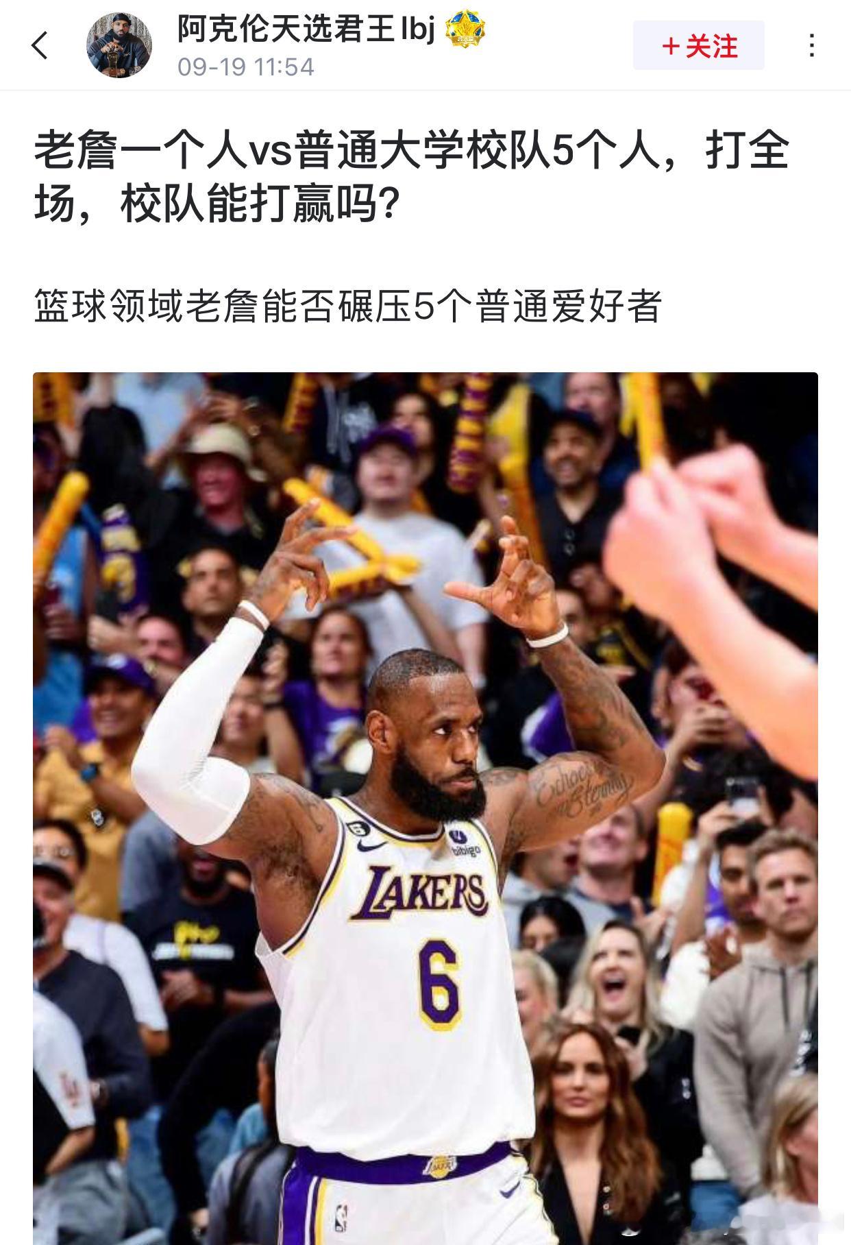 球迷讨论:詹姆斯一个人vs普通大学校队5个人,打全场,校队能打赢吗?