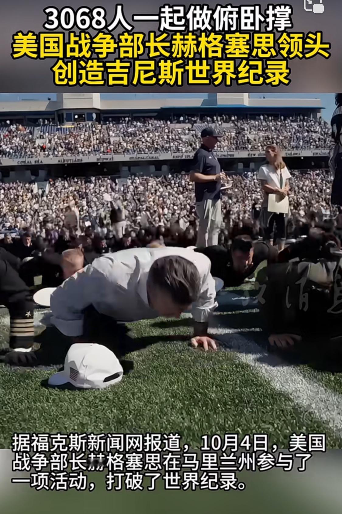 从“服从测试”会议到破纪录的“服从训练”,美战争部长的政治秀真的很“秀” 10月4日,美国国防部长皮特·赫格塞斯带领3068名军人同时做了一分钟“破纪录”的俯卧撑。 这场远超体能的政治秀,实则是赫格塞斯一系列治军举措中的一环。不光是在树立个人权威与强硬的、代表“战士精神”的个人形象,也是在推行其严厉整军的理念(从形体上重塑美军),更是一场潜在的“服从性测试”,旨在检验将领们是否愿意听从其指令。 此前赫格塞斯将约800名全球各地的美军高级将领紧急召回国内开会,被外界普遍认为其真正目的并非讨论军务,而是一场对特朗普政治忠诚度的公开测试。 总之,这位“战争部长”的俯卧撑秀,核心并非健身,而是一场服务于国内政治和个人权威的表演。它反映了当前美国军政关系中一些令人担忧的趋向——军事晋升和评价标准向个人忠诚和政治表态倾斜。 评一下,这总秀应该多做,下次别再只做一分钟,还有很多吉尼斯纪录需要你们打破,美军前途一片光明……