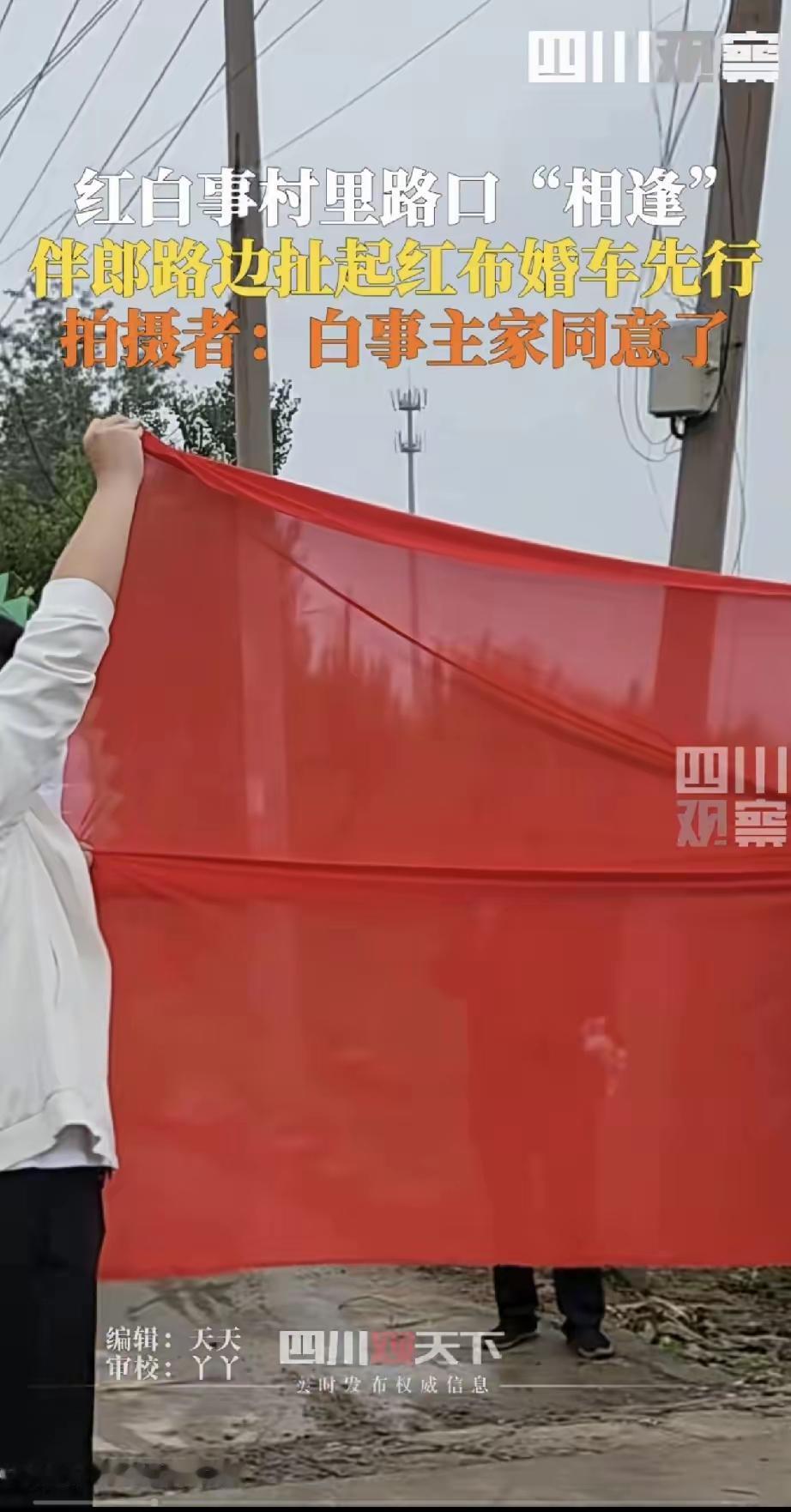 河南一结婚车队经过村路口,竟然碰到白事队伍挡路!伴郎立马下车,拿出一张红布遮住白事队伍,让婚车先行,对此白事主家也很善解人意,不仅没计较,反而主动让队伍靠边,拍摄者:按当地习俗,伴郎随身都带有红布,结局皆大欢喜! 当时两个队伍相遇后,同时停下!主家是个五十来岁的大叔,脸上虽带着悲戚,却没急着表态,只是朝婚车方向看了眼。谁也没先动,空气里都带着点紧张——毕竟红白事碰头,向来容易犯难。伴郎反应快,没等主事人商量就跳下车。他怀里揣着块红布,这是当地接亲的老讲究,怕遇上特殊情况。他背过身,把红布展开挡在中间,动作麻利又透着尊重。 那块飘展的红绸像道温柔的屏障,既护住了生者的欢欣,也呵护着逝者的安眠。老辈人说“红白不相冲”,可生活哪有那么多非黑即白的规则?这位伴郎深谙此道,他用祖传的智慧化解了一场潜在的尴尬。你看那大叔眼角泛起的水光,分明是被这份通透打动了——生死本是同根生的两棵树,何必非要争个你死我活? 围观村民举着手机的手渐渐放下,原本紧绷的氛围突然有了弹性。有人悄悄给白事乐队递去香烟,婚车上的新娘子隔着盖头轻轻点头致谢。这种心照不宣的默契,比任何仪式都更能诠释“礼”字真谛。在这个讲究彩头的年代,我们总怕触霉头,却忘了真正的吉利是人心换人心。 其实想想也有趣,人生最大的戏剧性莫过于迎亲的花轿与送葬的长幡狭路相逢。与其说这是场意外,不如说是命运特意安排的考场。答卷的人没有照搬教科书,而是用温度融化了冰炭不相容的旧例。那些刻板的禁忌条文,终究敌不过活生生的人性光辉。 各位读者你们怎么看?欢迎在评论区讨论。马路上拦婚车 婚车挡路 农村拦婚车