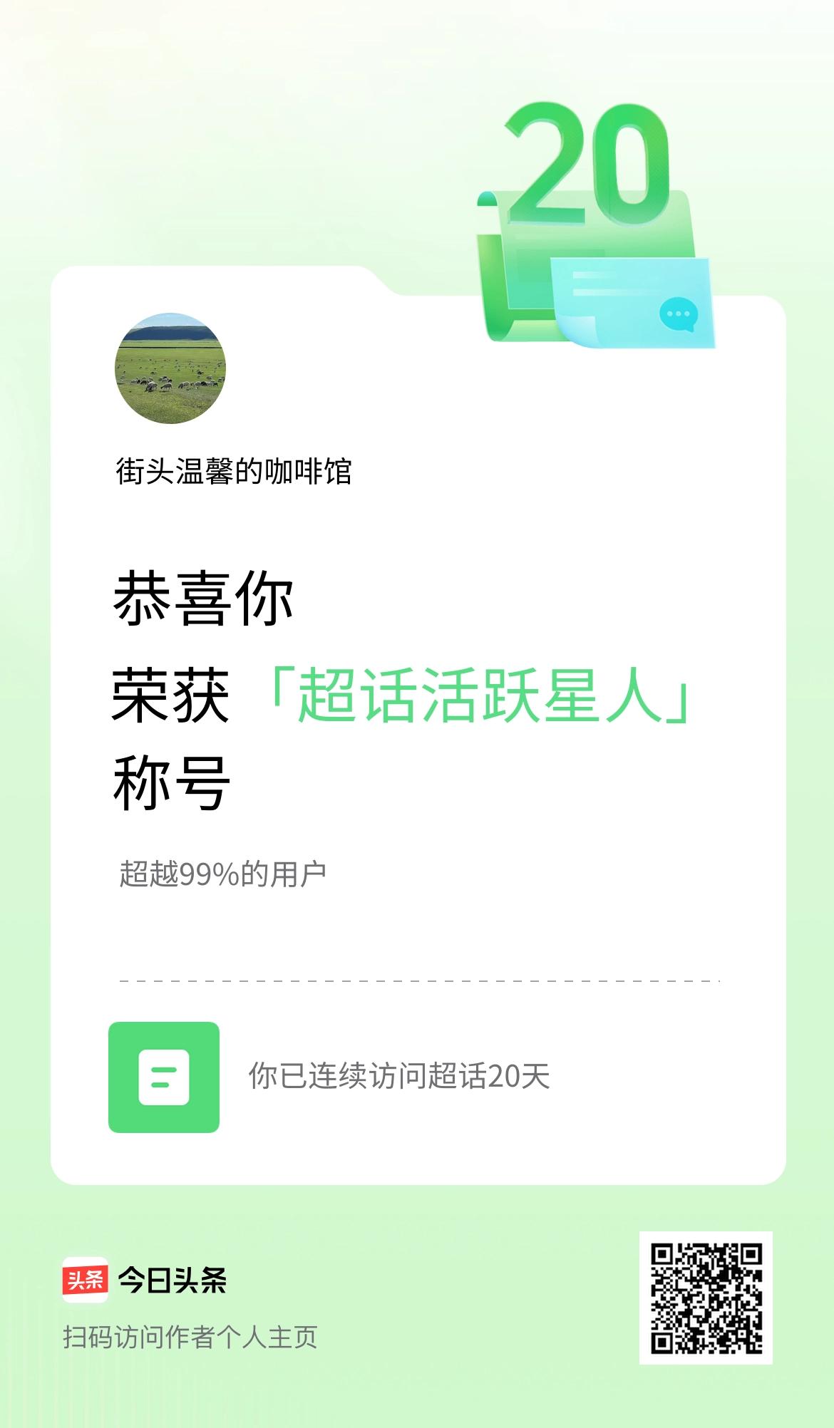 我在头条连续访问超话20天,获得“超话活跃星人“称号,你也快来超话看看吧~