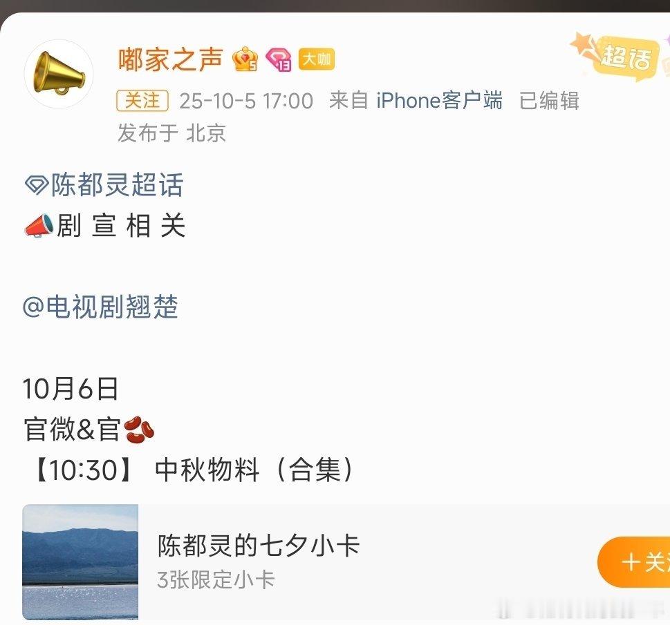 陈都灵《翘楚》明天有中秋物料👏🏻期待 [爱慕][爱慕][爱慕]