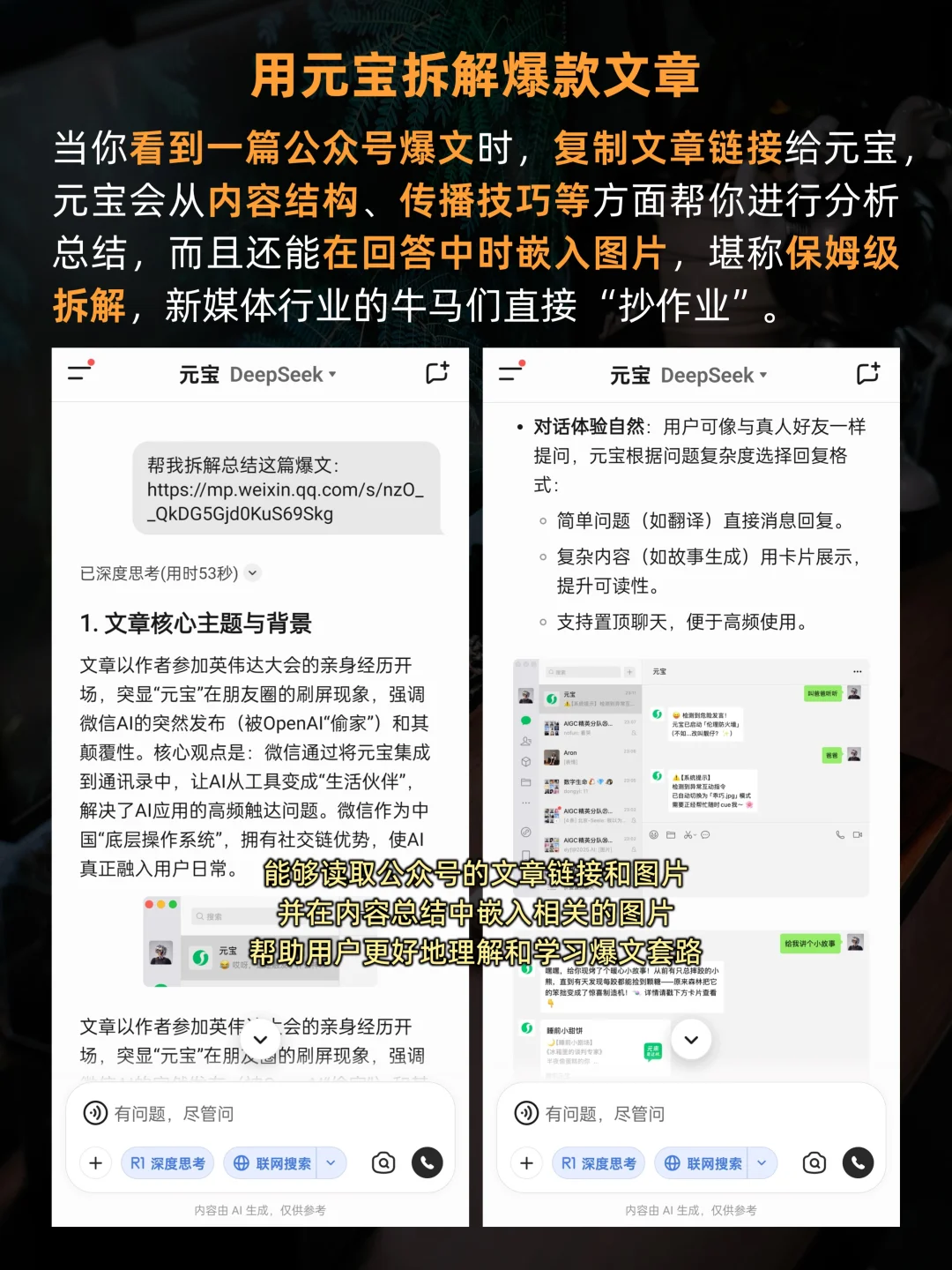 4⃣️ 当你看到一篇公众号爆文想学习时,复制文章链接发给元宝,元宝不仅能帮从选题、标题、内容等多方面帮你分析总结,而且还会在回答中时嵌入相关的图片,帮助你更好地理解学习,堪称保姆级拆解,新媒体行业的打工牛马们直接就能“抄”作业。