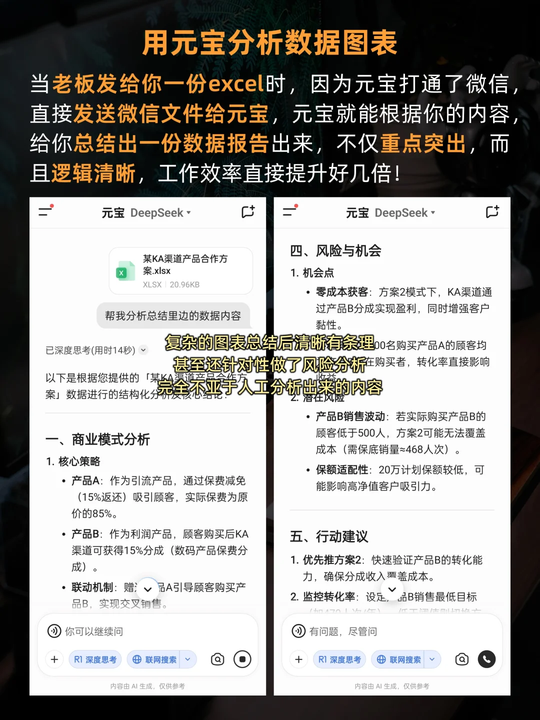 3️⃣ 当老板发给你一份excel让你分析时,因为元宝打通了微信,直接发送微信文件给元宝,元宝就能根据你的文件内容,给你总结出一份数据报告出来,不仅重点突出,而且逻辑清晰,工作效率直接提升好几倍!