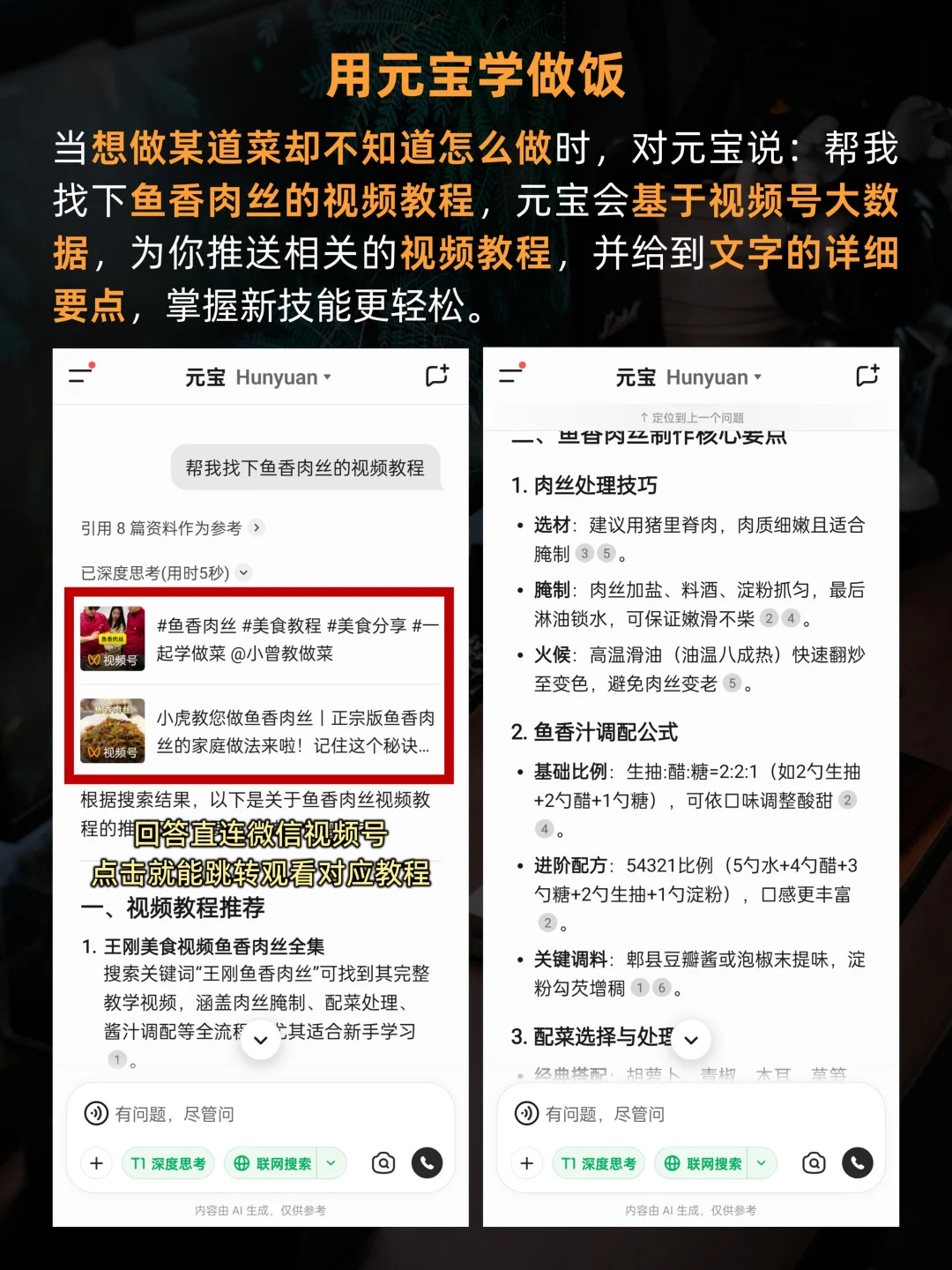 1⃣️ 当想做某道菜却不知道怎么做时,对元宝说:帮我找下鱼香肉丝的视频教程,元宝会基于视频号大数据为你推送视频教程,并给到文字的详细要点,掌握新技能更轻松。