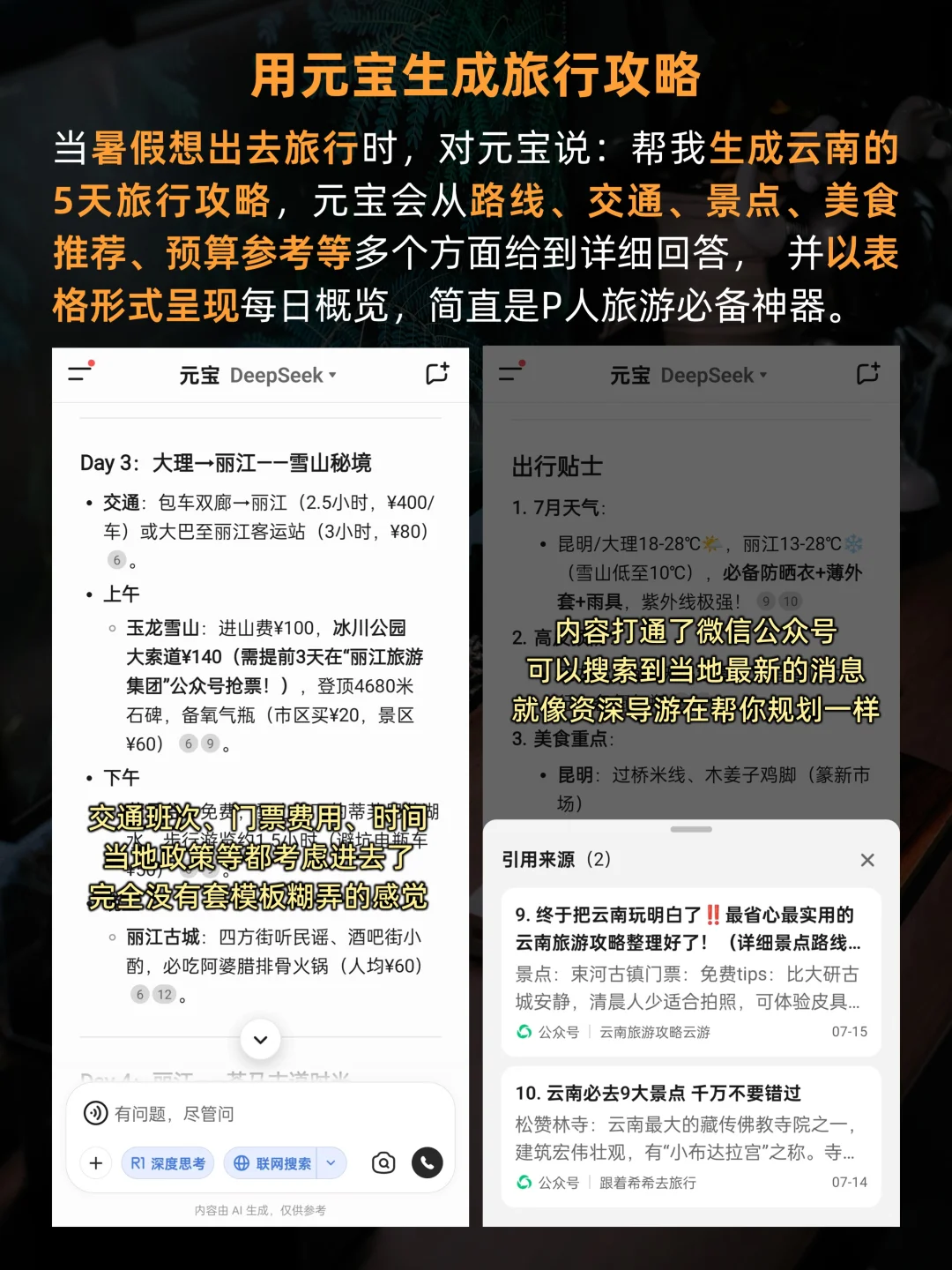 2️⃣ 当暑假想和闺蜜出去旅行时,对元宝说:帮我生成一份云南的5天旅行攻略,元宝会从路线、交通、景点、美食推荐、预算参考等多个方面给到详细回答, 并以表格形式呈现每日概览,旅游攻略1分钟get,简直是P人旅游必备神器。