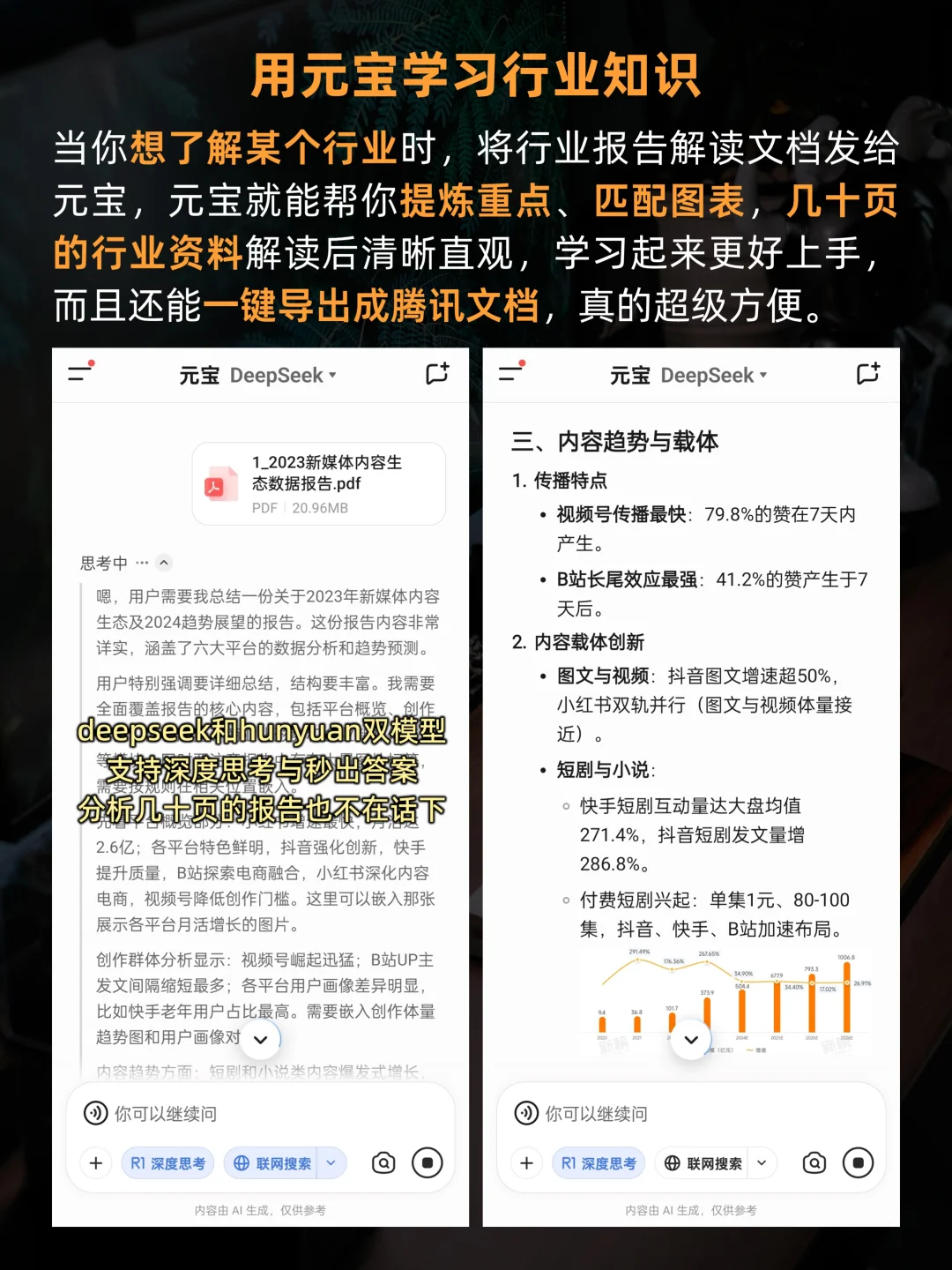 5⃣️ 当你想要深入了解某个行业时,直接将行业报告解读文档发给元宝,元宝就能帮你提炼重点、匹配图表,几十页的行业资料,解读完清晰直观,学习起来更好上手,而且还能一键导出成腾讯文档,真的超级方便。