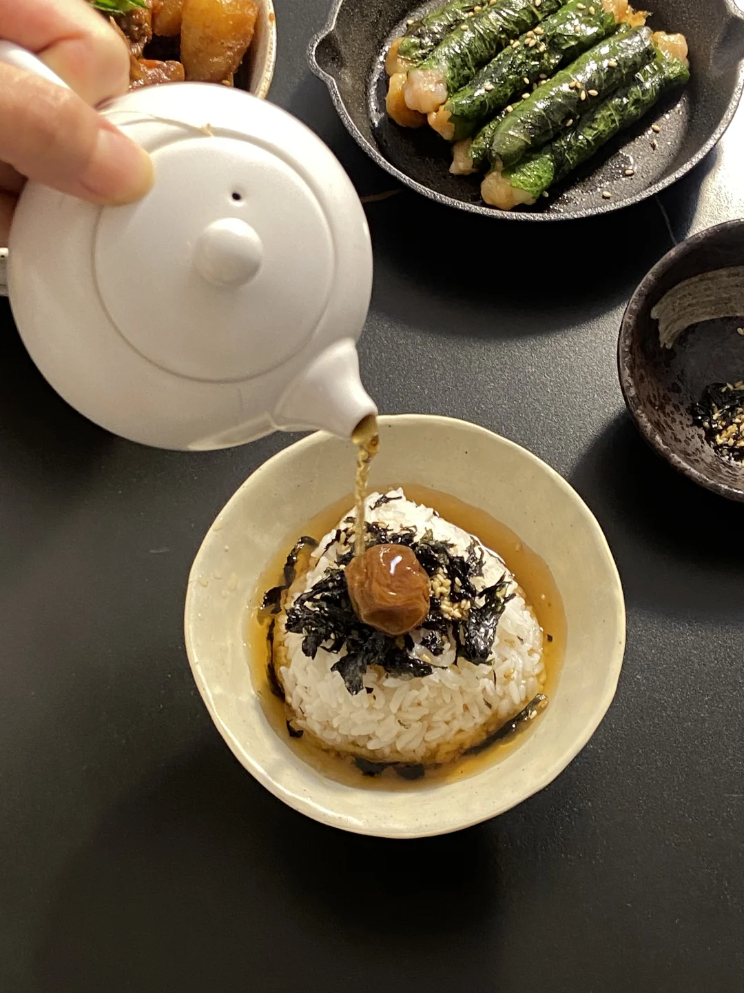 1)先泡好一壶茶,把米饭煮好,加入海苔碎和一颗梅子