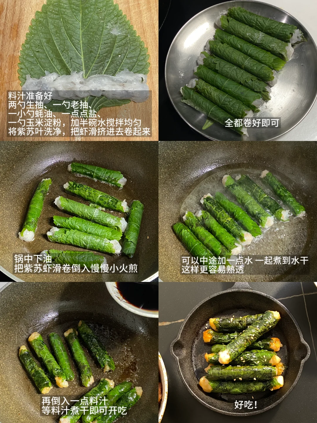 3)锅中下油,把紫苏虾滑卷倒入慢慢小火煎,可以中途加一点水一起煮到水干,这样更容易熟透,再倒入一点料汁,等料汁煮干即可开吃