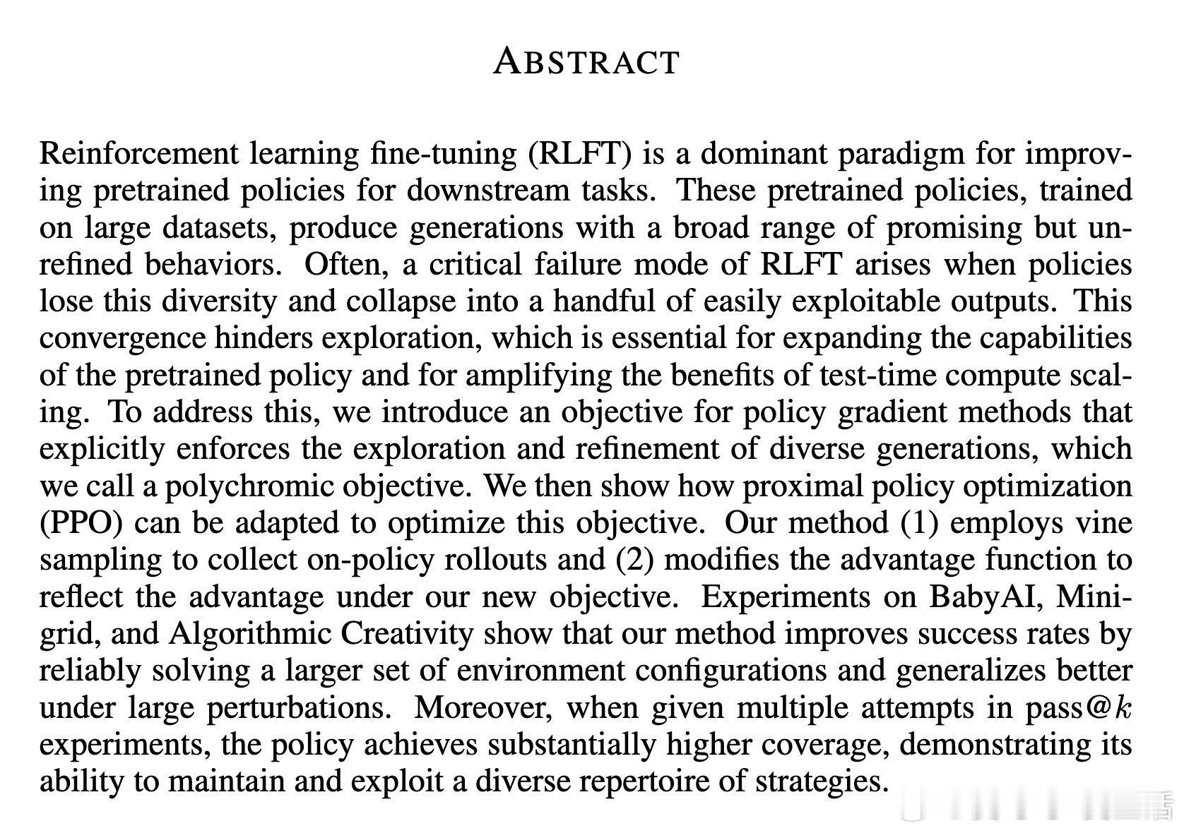【论文解读】《Polychromic Objectives for Reinforcement Learning》来自斯坦福,探讨了强化学习微调(RLFT)中探索多样行为的重要性及挑战。传统RLFT往往导致“熵坍缩”,策略过早集中于少数高回报行为,丧失多样性和探索能力,限制了策略的泛化和扩展能力。