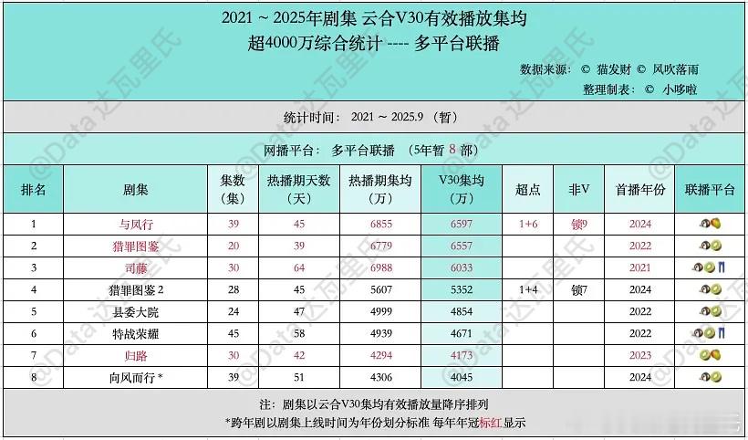 2019-2025多平台联播剧云合热播期集均·V30集均>4000万剧集,31部,标红为当年冠