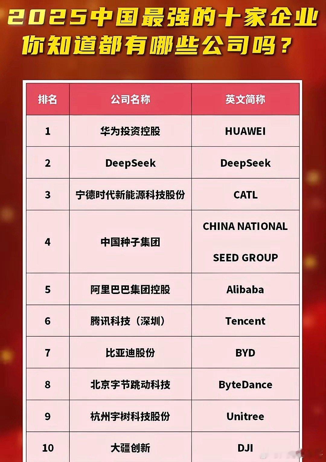华为排名榜第一名众望所归,DeepSeek第二浪得虚名,宁德时代排名第三勉勉强强,中国种子集团行业龙头地位第一 ………