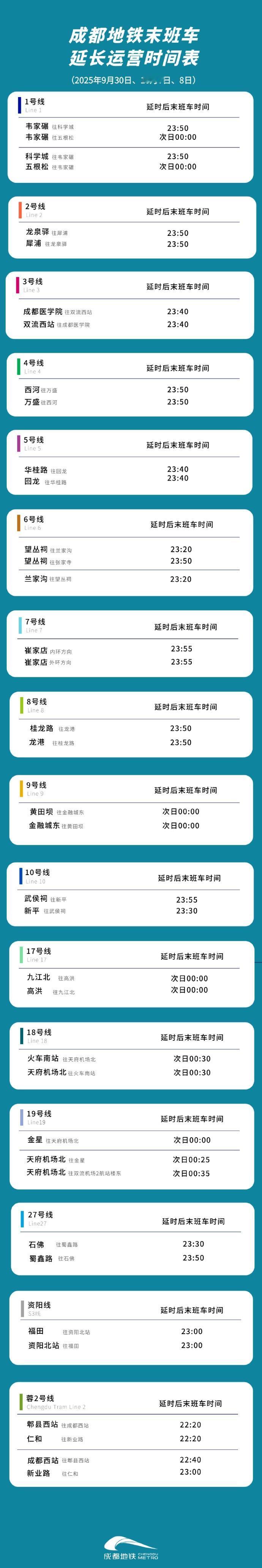 其他资讯【转发提醒!明后两天成都地铁延时运营】国庆中秋假期来到尾声,成都地铁将开展延时运营服务。节后最后两天(10月7日、8日)延长线网各线路末班车时间50-60分钟,延时后各线路末班车时间具体安排如下↓(锦观新闻)