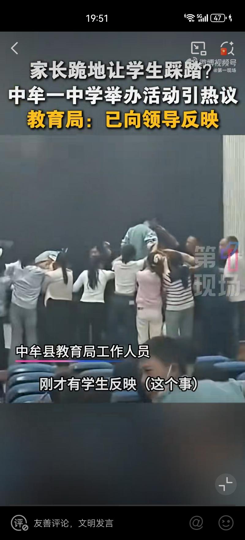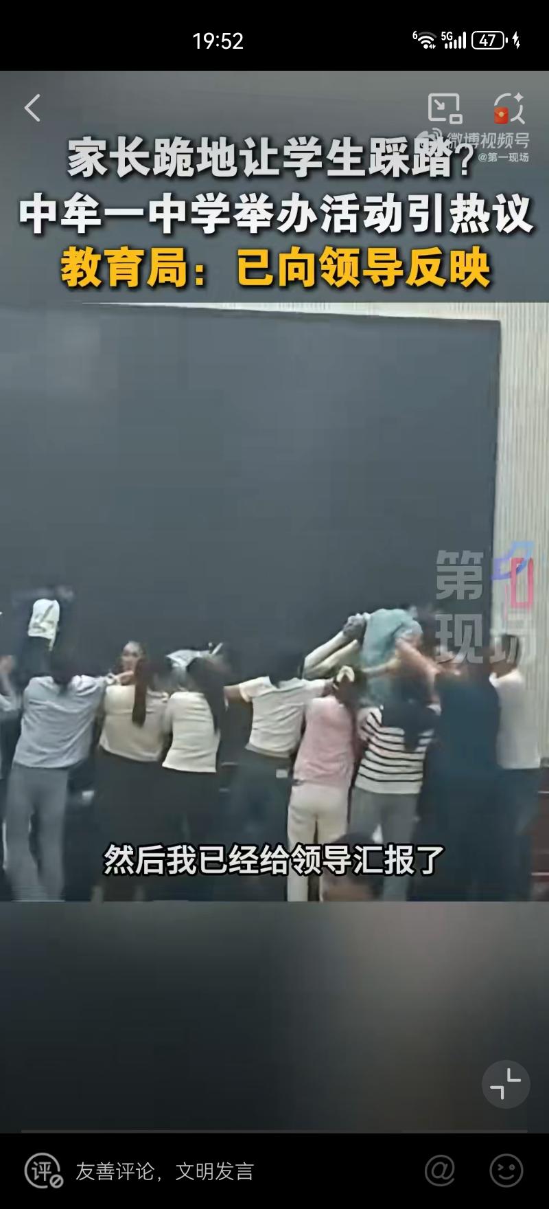 这个世界越来越神奇了,家长跪地被学生轮流踩踏,这是教育吗?我就想问问学校这是教育吗?我就想问问大家这应该是学校教的教育吗? 河南郑州中牟县某中学“愧疚式感恩教育”,要求数十名家长跪地俯身组成“人桥”,学生需快速踩踏家长背部通过,部分家长现场被迫配合。 让爹娘跪在地上,这算哪门子的教育?这是把孝心碾碎了往孩子脸上浇!这种形式主义,完完全全是在扭曲正常的价值观,学生被迫踩踏父母,只会滋生不必要的负罪感,扭曲对亲情的健康认知,而家长当众跪地,更是对其人格尊严的公开践踏 感恩的种子,不会在尊严的废墟上生长! 无论如何都不需要采取这种方法,真正的德育需要以平等尊重为基石,以理性引导取代情感绑架。 必须严查,追责到底! (图片来源:第一现场微博视频截图)