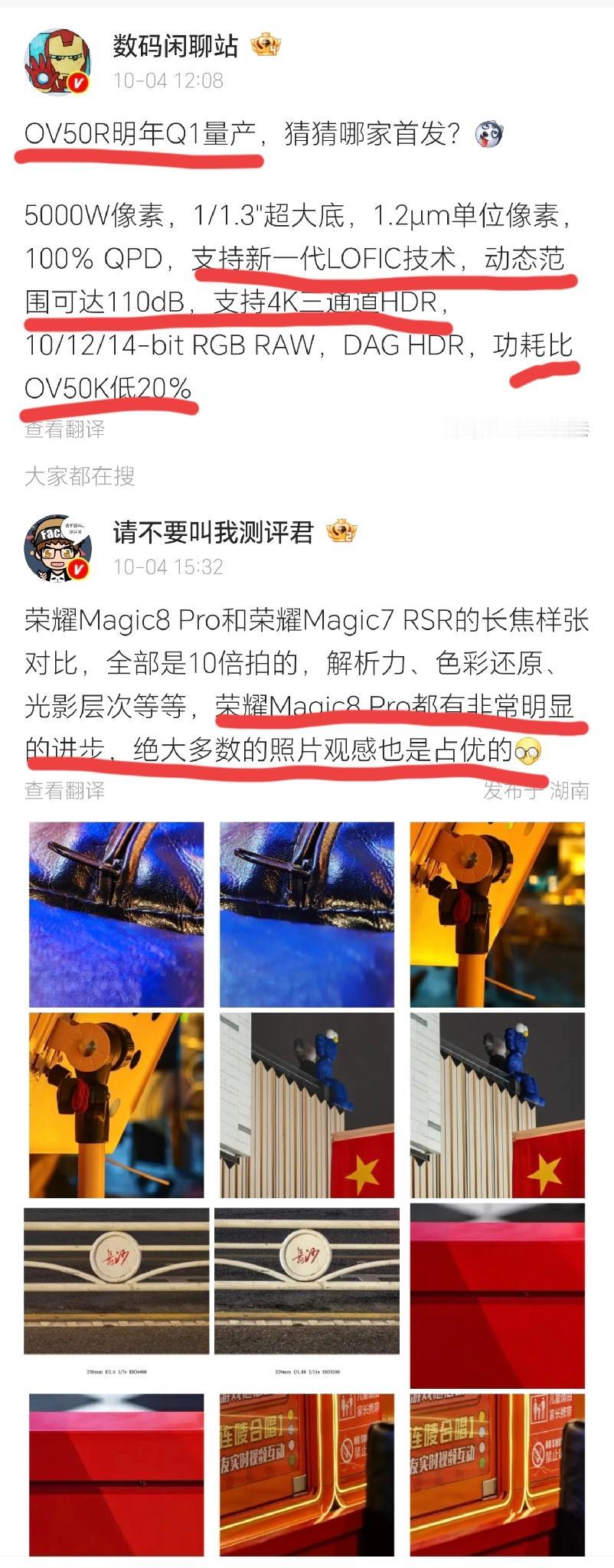 果不其然!荣耀Magic8系列真是在憋王炸,光Magic8 Pro的影像就能干翻上代保时捷版本,而Magic8 Ultra更是要首发OV50R主摄,看来荣耀誓要在影像方面扭转一下口碑[思考] 说实话,看完新款的影像实测,我真的迫不及待想换新款了,现在手里的Magic7完全不香了[捂脸]