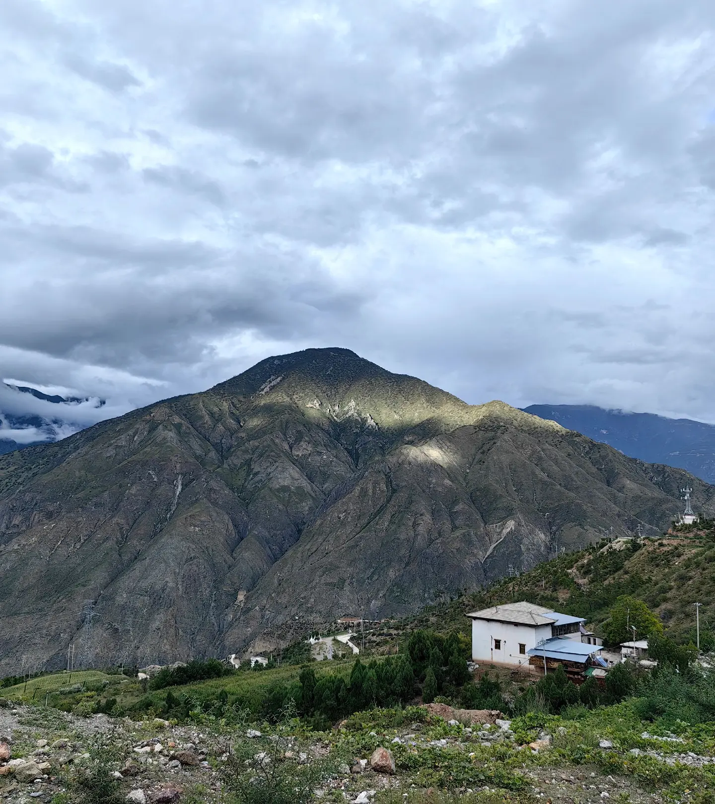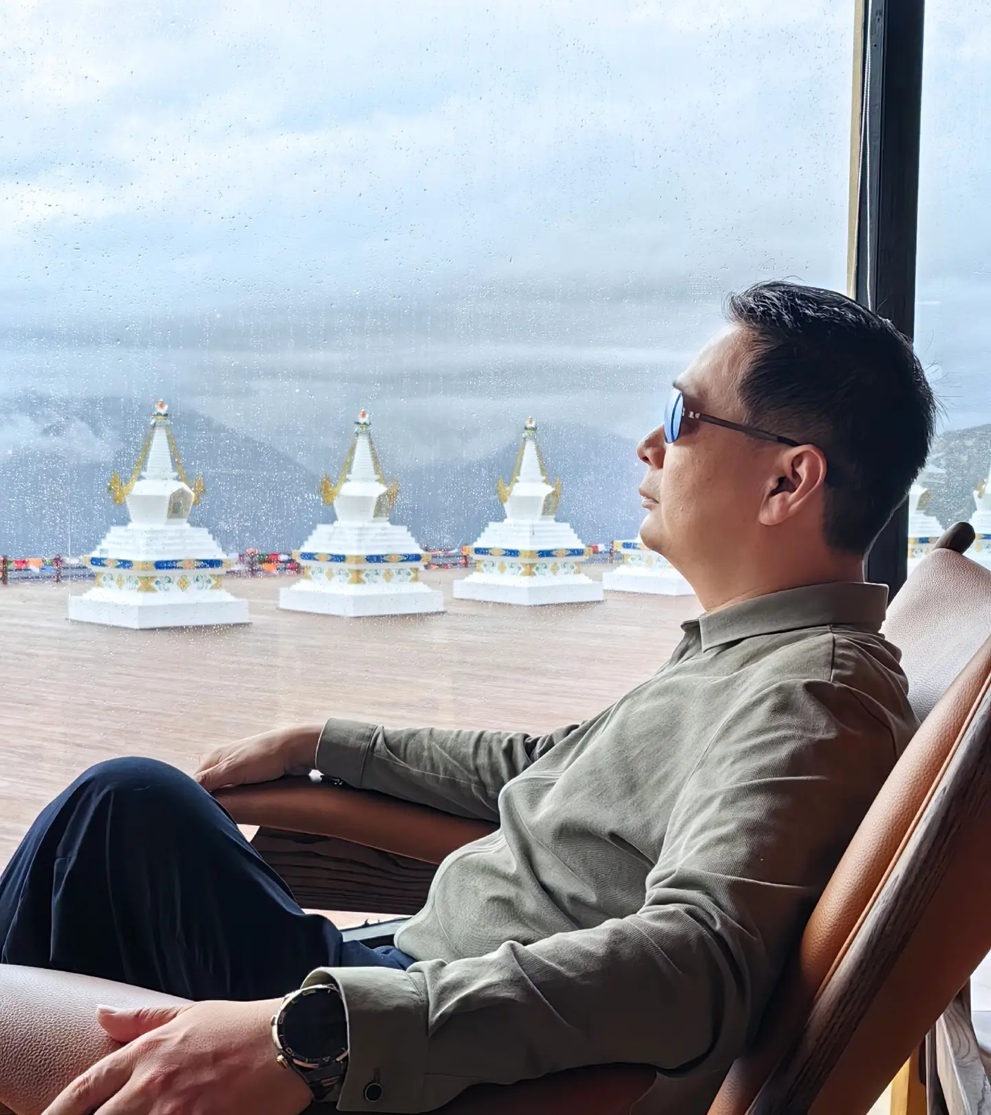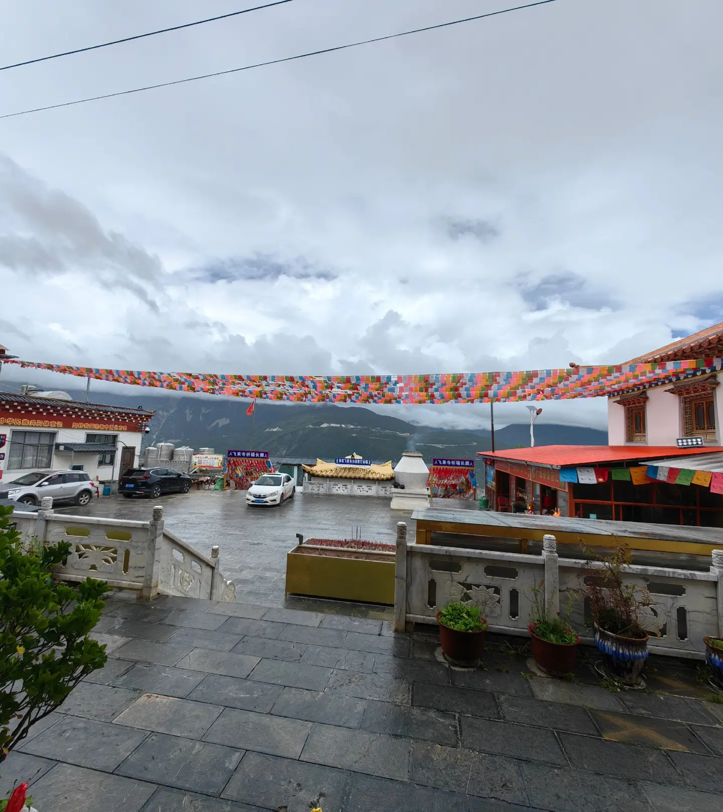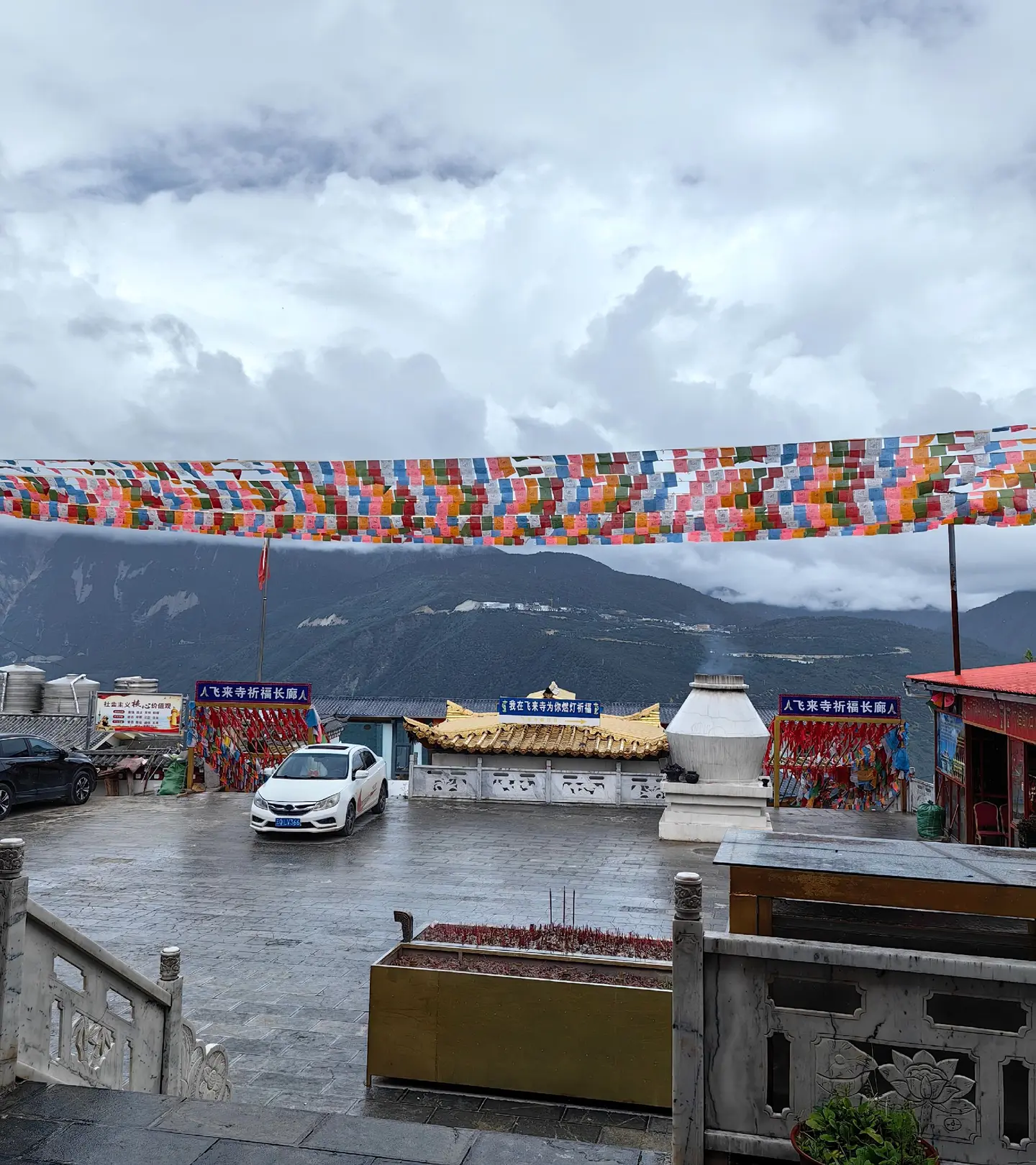 飞来寺并非你所想的横绝孤崖,而是一座小巧精致的寺庙,门口一个大大的观景台,可以看到对面的梅里雪山山脉。飞来寺,很小巧,门口坡很陡。刚出门就下雨了,早知道就把车直接开寺门口来。我是个幸运儿吗?显然不是。跋山涉水而来,指望能看到梅里雪山,结果只看到雾气蒙蒙。点上一杯奶茶,坐在落地窗前等雾散去,结果等来了一场小雨。峰兄在白塔前翱翔起舞,而我在等待中不知不觉昏昏睡去,醒来时已近傍晚。但是奇迹发生在我归去的途中。车过金沙江大拐弯处,雾气退尽,太阳出来,正好笼罩了我眼前的金字形山峰。日照金山,我看到了日照金山!天佑我楚,屹立东方,国祚延绵,子孙承乾,福厚如海,恩泽万世。听朋友说,江城正在下大雨,即兴而作小诗一首。 赏金山望江城 此间金山日方照, 遥闻江城雨沱溏。 人间最是公平处, 几番得意几凄凉。