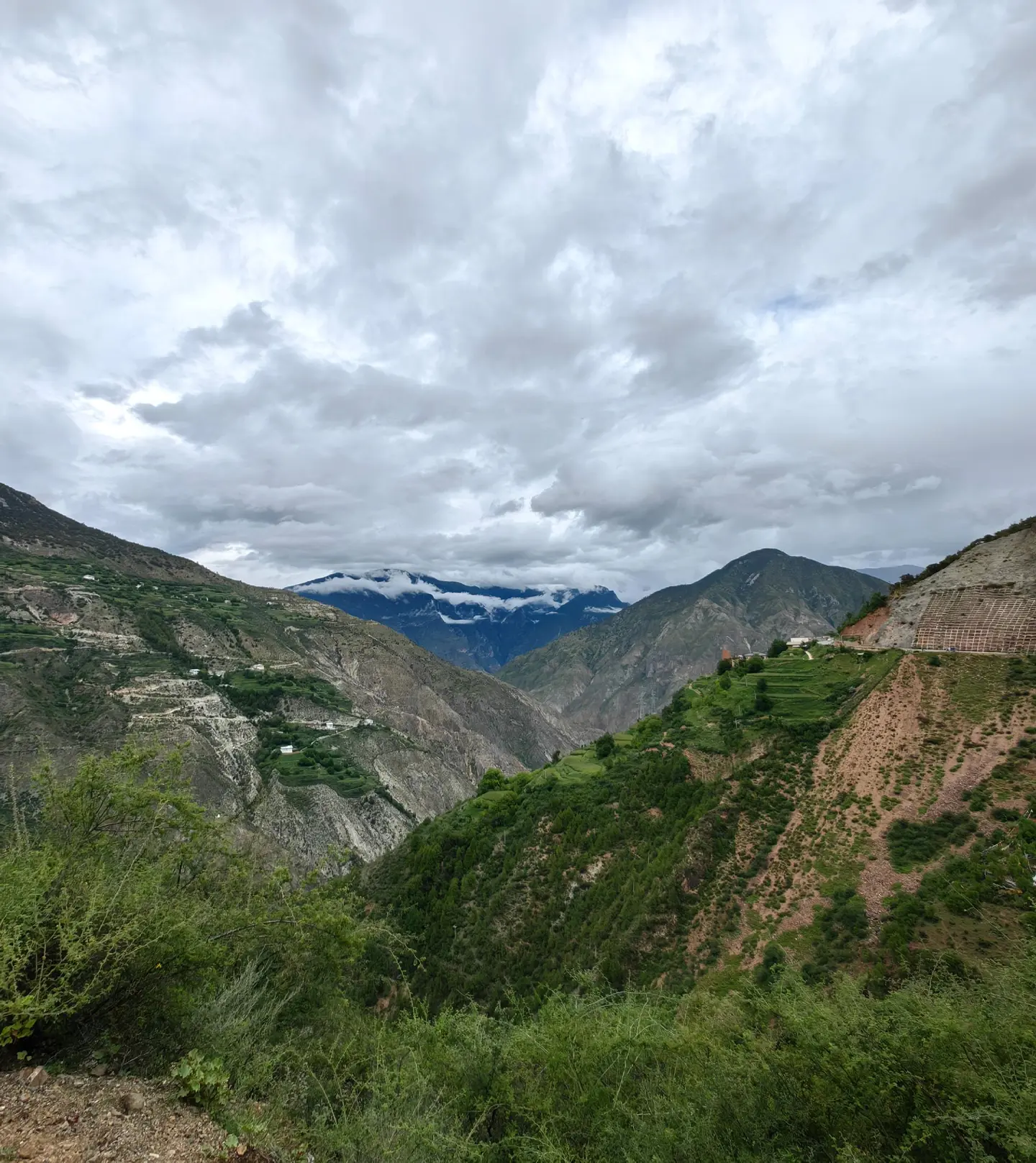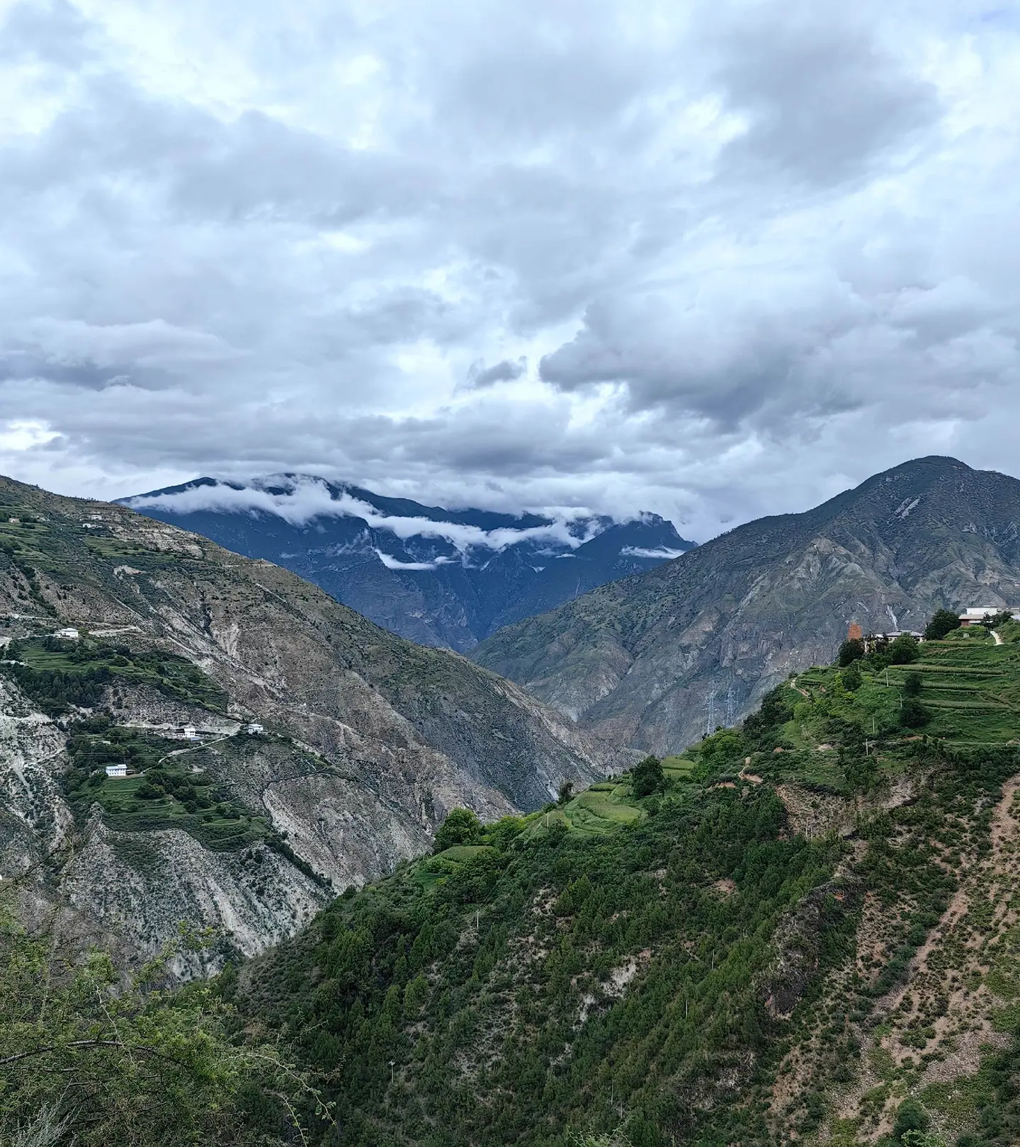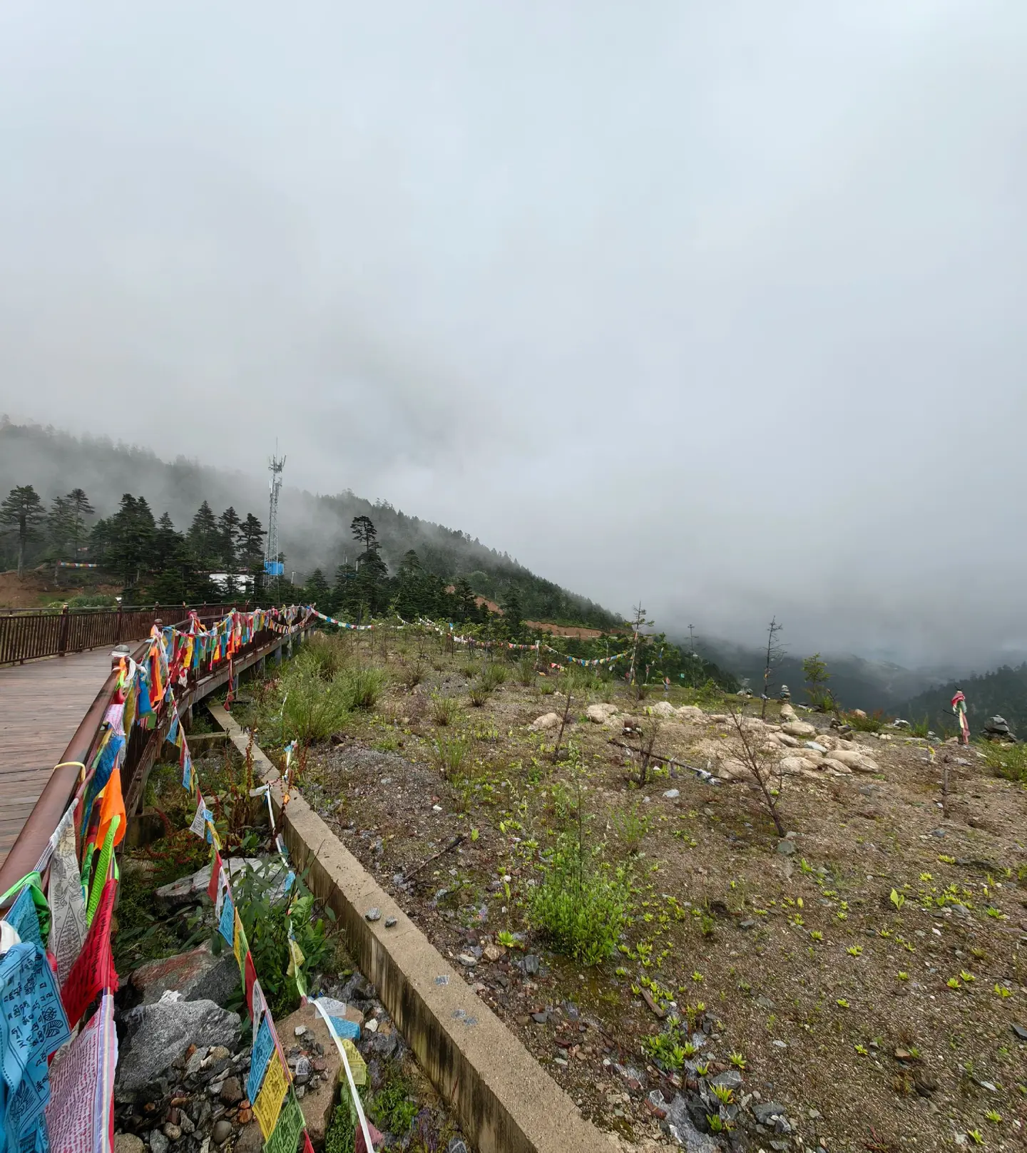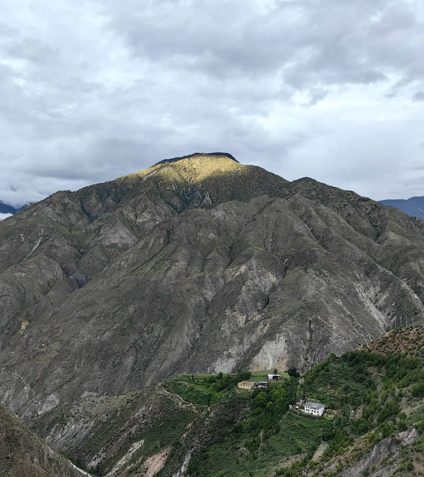 飞来寺并非你所想的横绝孤崖,而是一座小巧精致的寺庙,门口一个大大的观景台,可以看到对面的梅里雪山山脉。飞来寺,很小巧,门口坡很陡。刚出门就下雨了,早知道就把车直接开寺门口来。我是个幸运儿吗?显然不是。跋山涉水而来,指望能看到梅里雪山,结果只看到雾气蒙蒙。点上一杯奶茶,坐在落地窗前等雾散去,结果等来了一场小雨。峰兄在白塔前翱翔起舞,而我在等待中不知不觉昏昏睡去,醒来时已近傍晚。但是奇迹发生在我归去的途中。车过金沙江大拐弯处,雾气退尽,太阳出来,正好笼罩了我眼前的金字形山峰。日照金山,我看到了日照金山!天佑我楚,屹立东方,国祚延绵,子孙承乾,福厚如海,恩泽万世。听朋友说,江城正在下大雨,即兴而作小诗一首。 赏金山望江城 此间金山日方照, 遥闻江城雨沱溏。 人间最是公平处, 几番得意几凄凉。