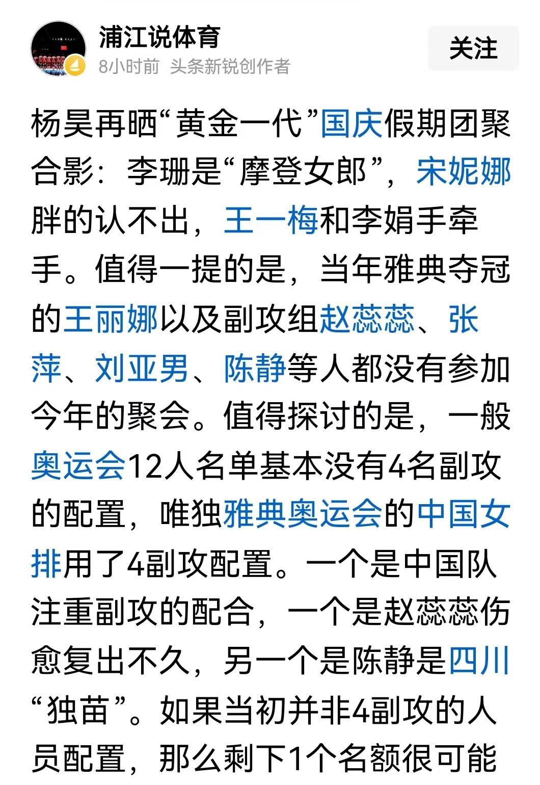 开始“转移火力”? 赖亚文、赵勇久未发声, 就连博士盖洋也沉默不语 不过平常比较喜欢自己家小狗狗的杨昊还是不甘寂寞 不过这一次不是为了其他 发出来的照片都是黄银一袋的照片 看来要用黄金一代都辉煌去掩盖自己的失败 不过这一次名嘴浦江继续说实话 说为何雅典奥运会带了四个副攻 主攻不强永副攻上 这是黄金一代最典型的特征 一代黄金人打出来 其他的位置不是很出名 最出名的反倒是二传冯坤 以及副攻张平以及副攻赵蕊蕊 不过上一次赵蕊蕊好王奥芊见面 可是把王奥芊害苦了 从此赵勇力排王奥芊 最终王奥芊退出国家队 没有公心的一个团队, 总是惦记自己的小团队